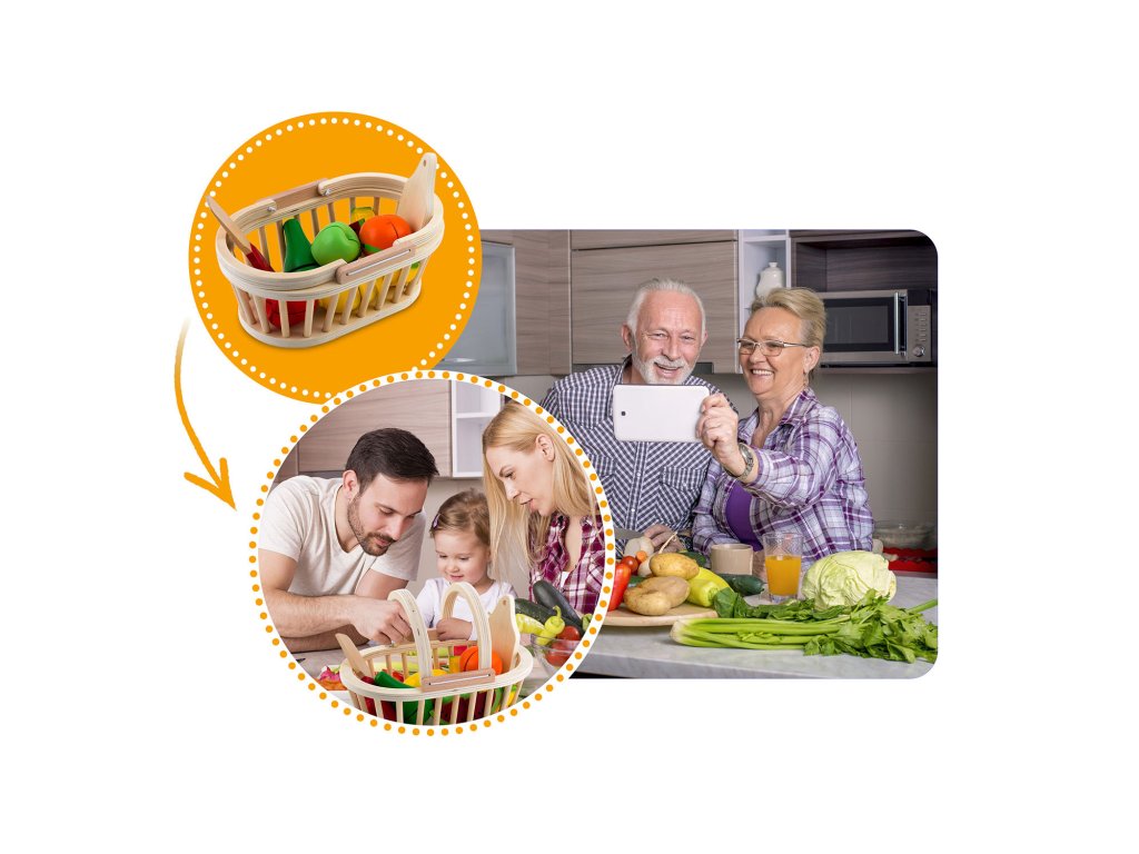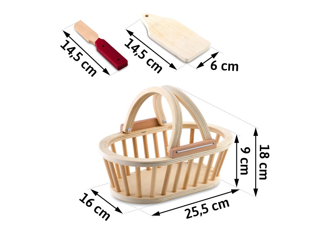 - Priložena lesena košara olajša shranjevanje in prenašanje kompleta. Omogoča igro trgovine.