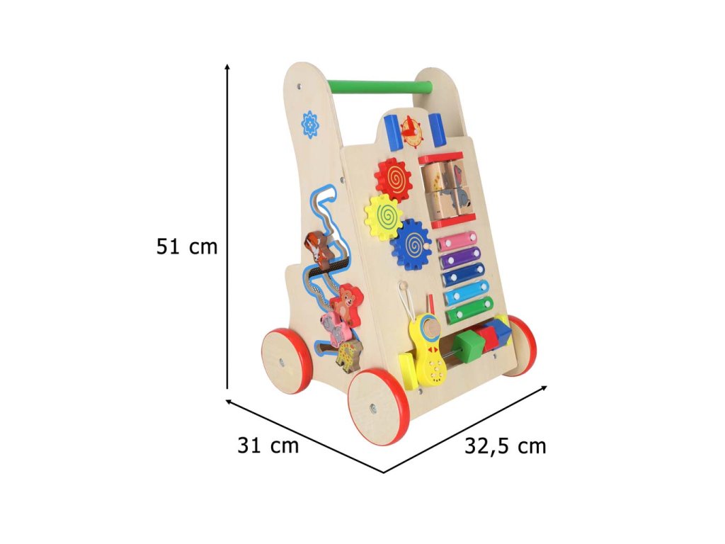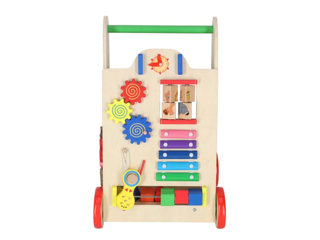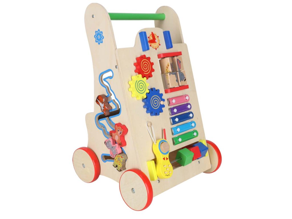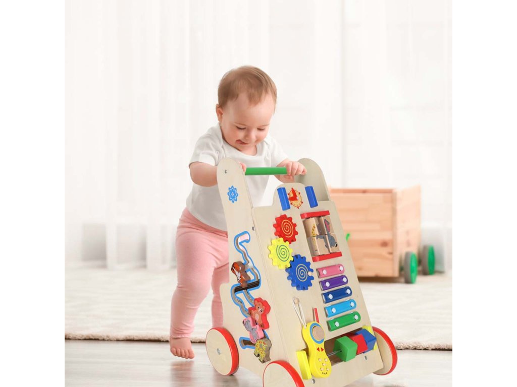 To ni le hodulja! Ustvarjalci so poskrbeli, da malčkom prinaša zabavo na več načinov. Na prednji strani vozička je manipulativna plošča polna elementov, ki veselijo otroke: