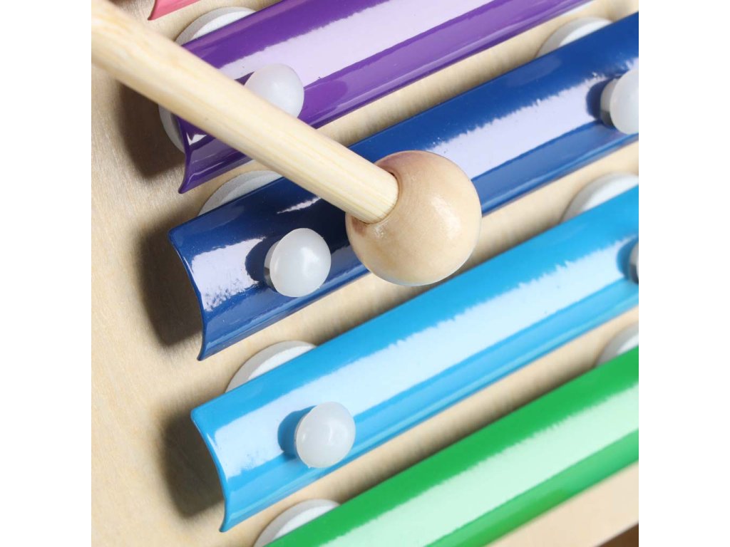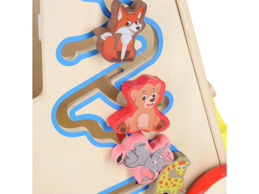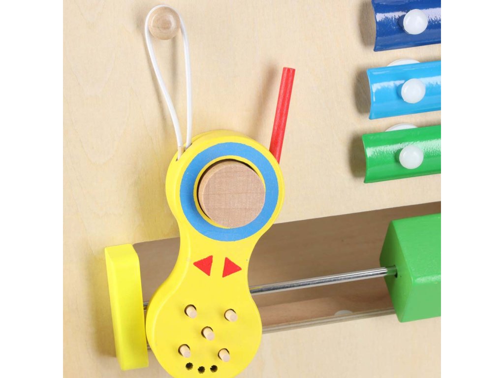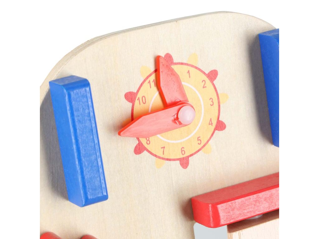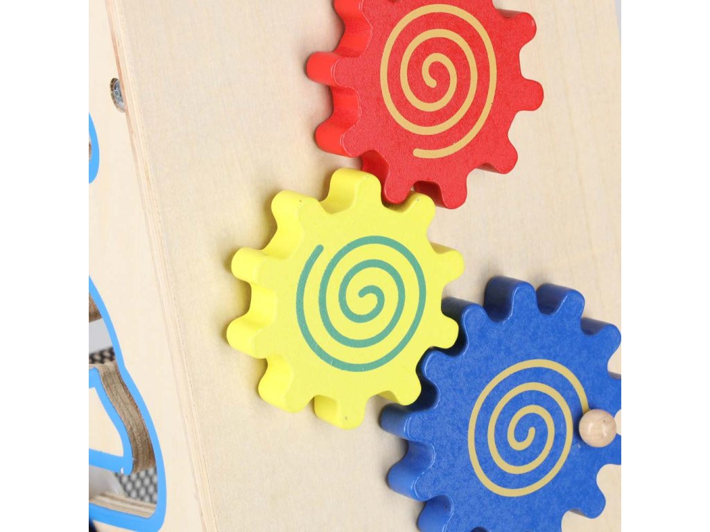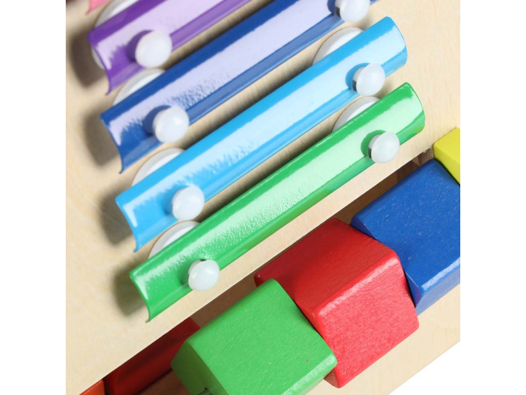 Barvni elementi pritegnejo oko in majhne ročice s svojimi barvami. Zahvaljujoč nevtralni leseni osnovi igrača hkrati otroku ne daje pretiranih dražljajev.
