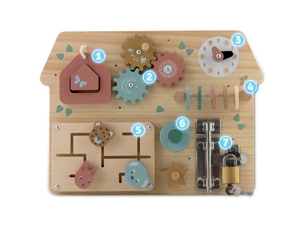 Senzorična deska, navdihnjena po metodi Montessori, spodbuja učenje skozi dejavnost in otroku omogoča samostojno raziskovanje funkcij vsakega elementa.