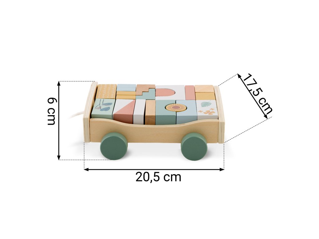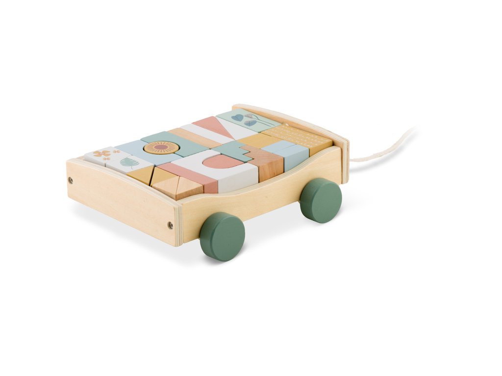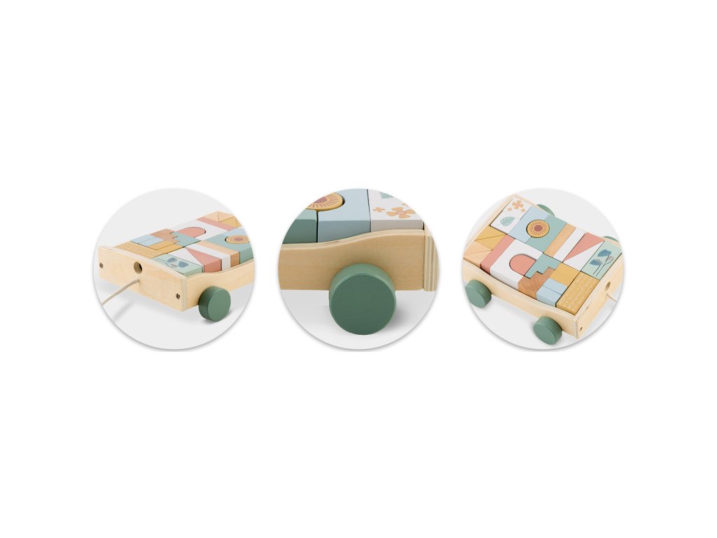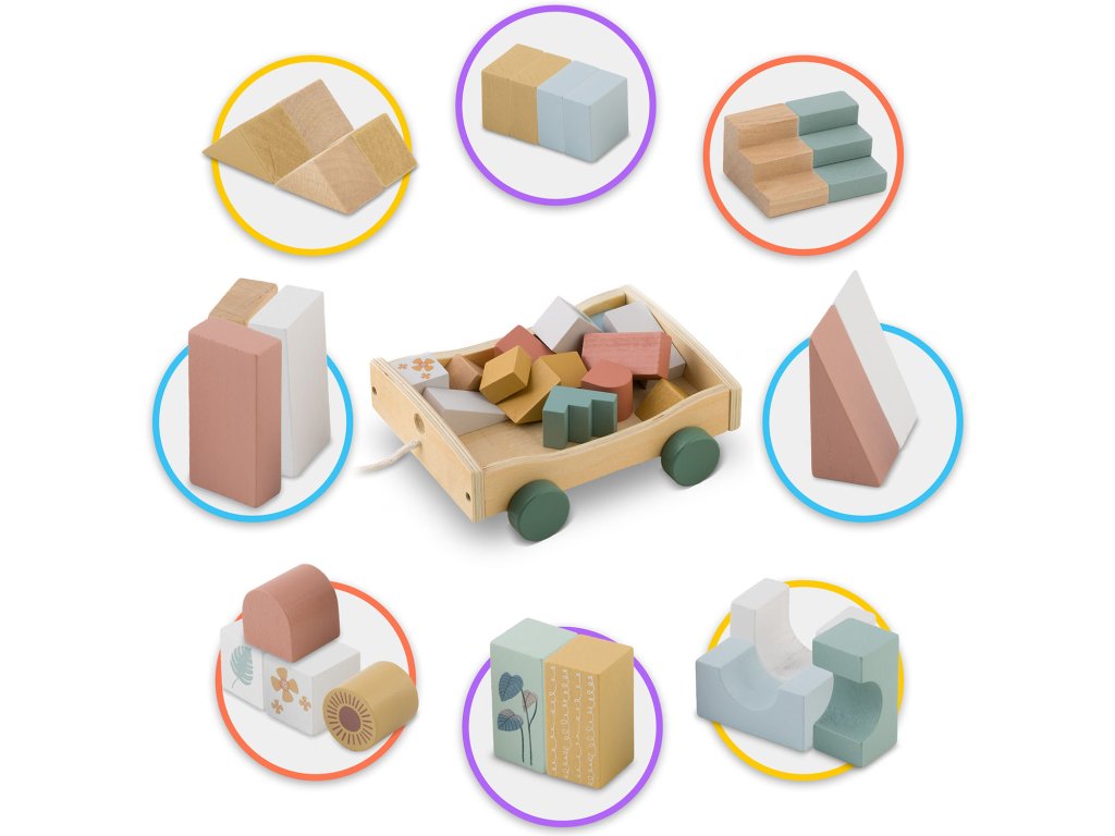 - Voziček z bloki združuje izobraževalne elemente s fizično aktivnostjo, spodbuja otroke k ustvarjalnemu razmišljanju.