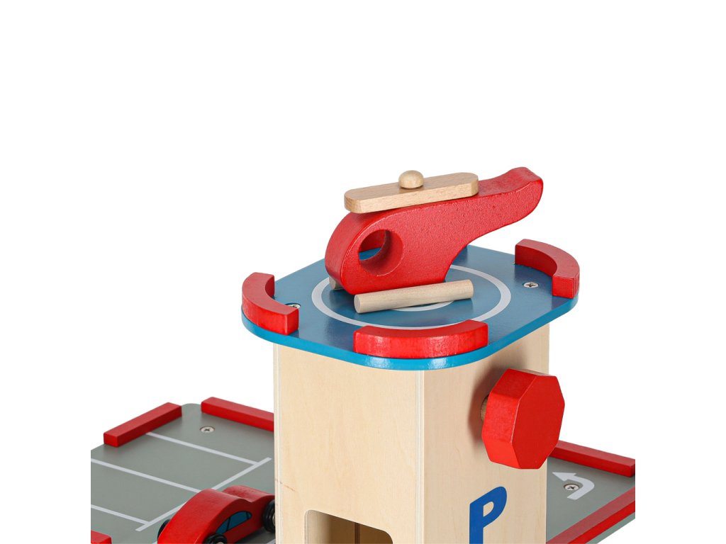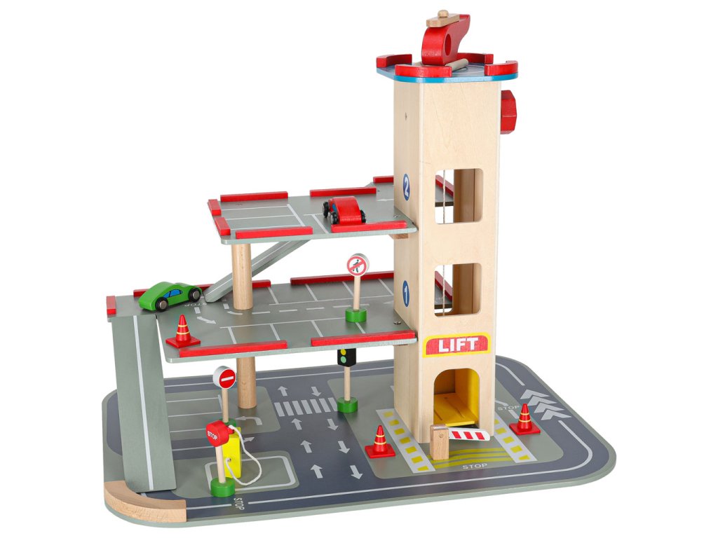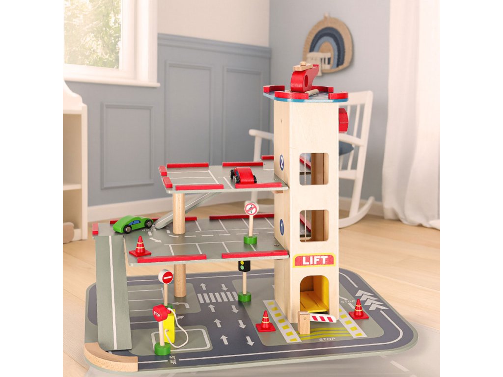 Lepa lesena mestna garaža ima štiri nivoje! Prve tri so namenjene avtomobilčkom - tu je prostor za lesene avtomobilčke, ki so del kompleta, pa tudi za številna druga vozila vašega otroka. Na naslednje nivoje se lahko povzpnete z dvigalom!