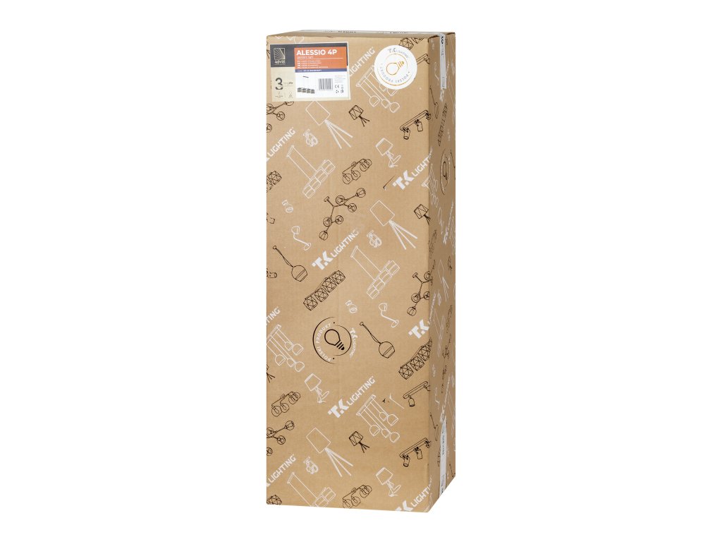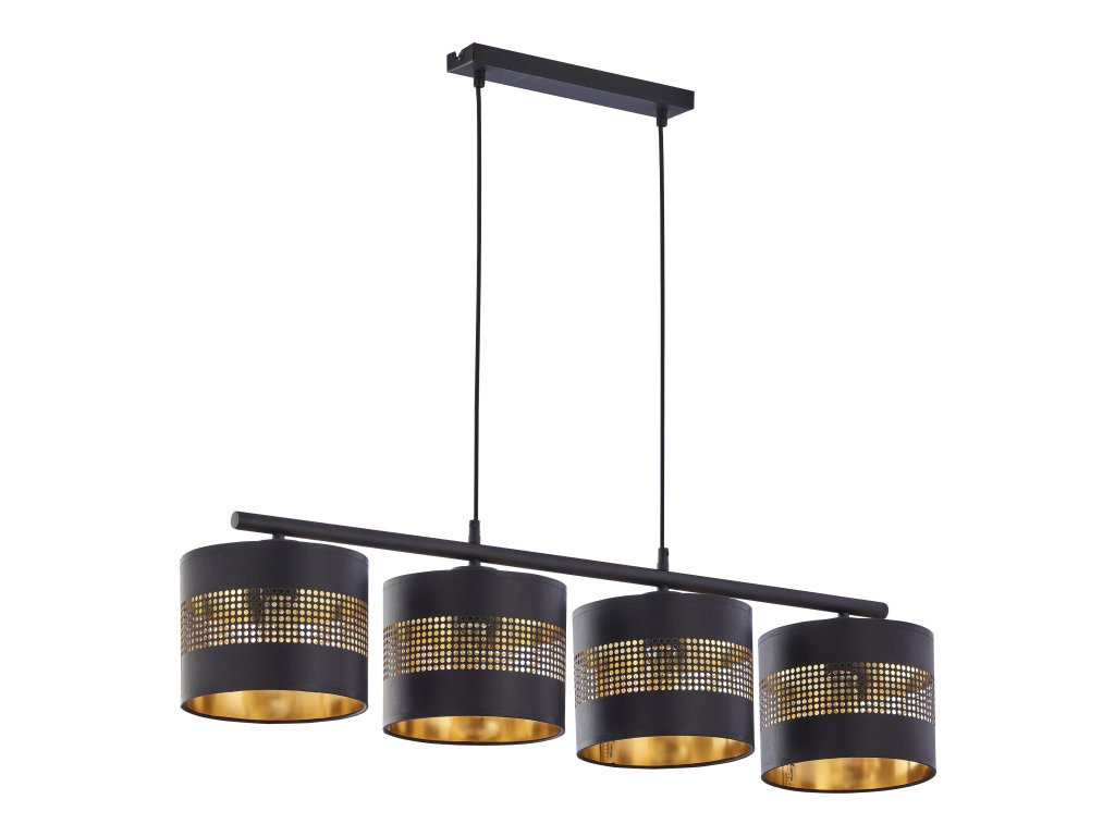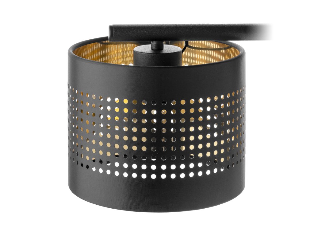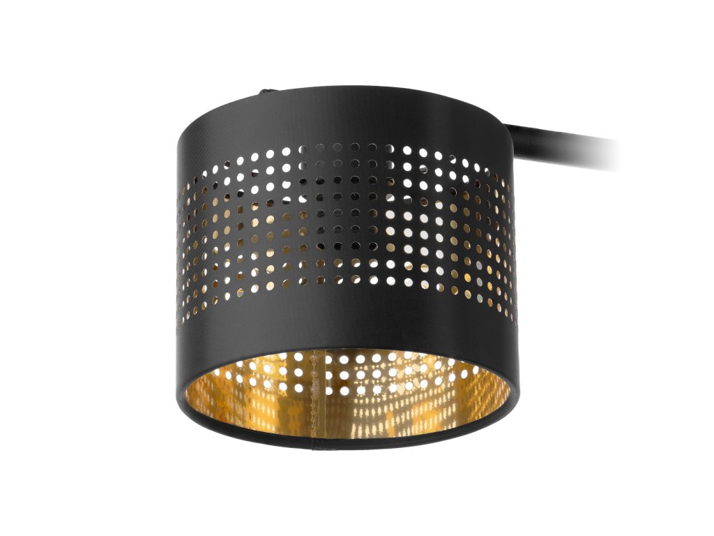 Lestenec ALESSIO je izdelan v modernem slogu. Črni senčniki iz nizozemske tkanine, ki so z notranje strani obloženi z zlato folijo, dodatna prednost so z laserjem izrezane majhne odprtine v obliki kvadrata, ki z prepuščanjem svetlobe ustvarjajo na stenah nežne vzorce. Na voljo je tudi različica z enim svetlobnim virom.