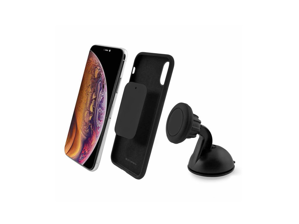 Moderen, stabilen in magnetni nosilec za telefon v avtomobilu, pritrjen na vetrobransko steklo vozila. Telefon (ali druga elektronska naprava) je pritrjen s pomočjo posebne magnetne ploščice, zaradi katere varno drži med vožnjo.