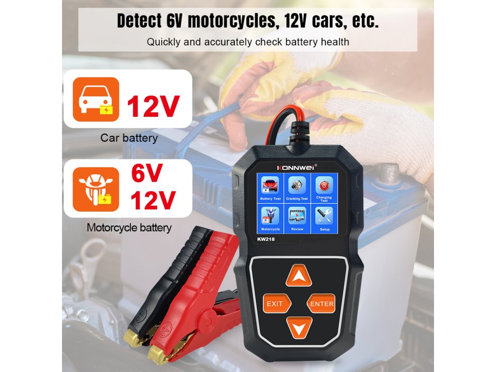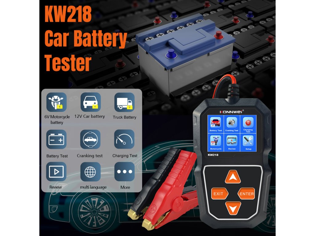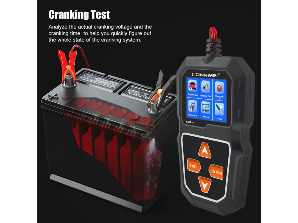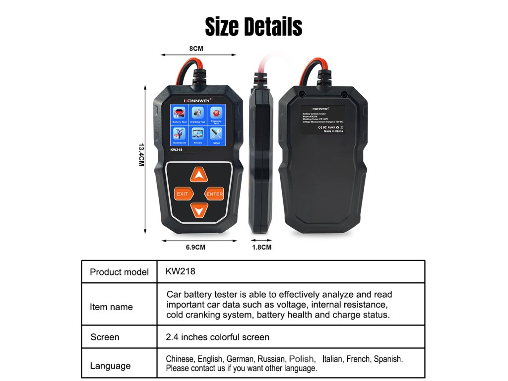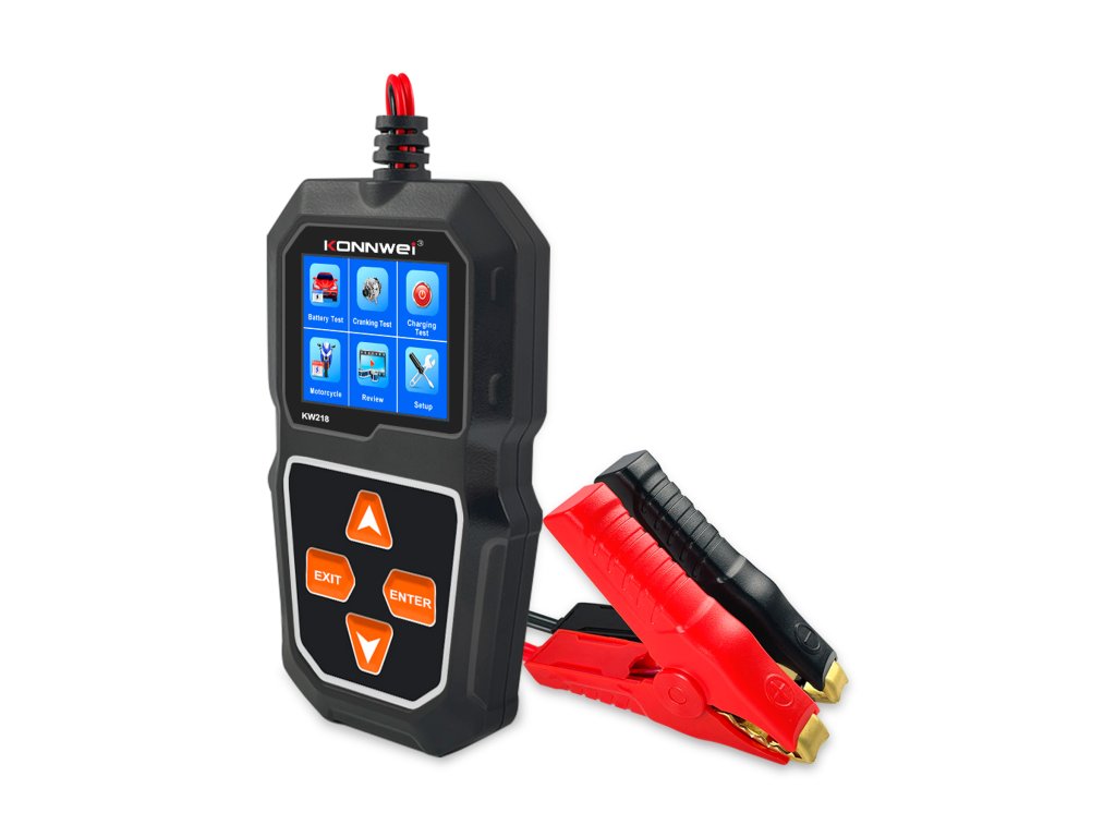 Merilnik baterij Konnwei KW218 je praktično in zanesljivo orodje za preverjanje stanja akumulatorja v razponu napetosti od 6 do 12 V. Omogoča odčitavanje ključnih parametrov, kot so SOC (stopnja napolnjenosti), SOH (stanje zdravja) ter notranja upornost, kar omogoča hitro in natančno oceno stanja baterije. Merilno območje je od 100 do 2000 CCA, vsi podatki pa so prikazani na jasnem LCD zaslonu.