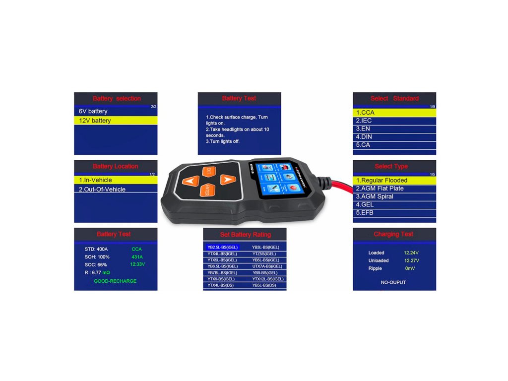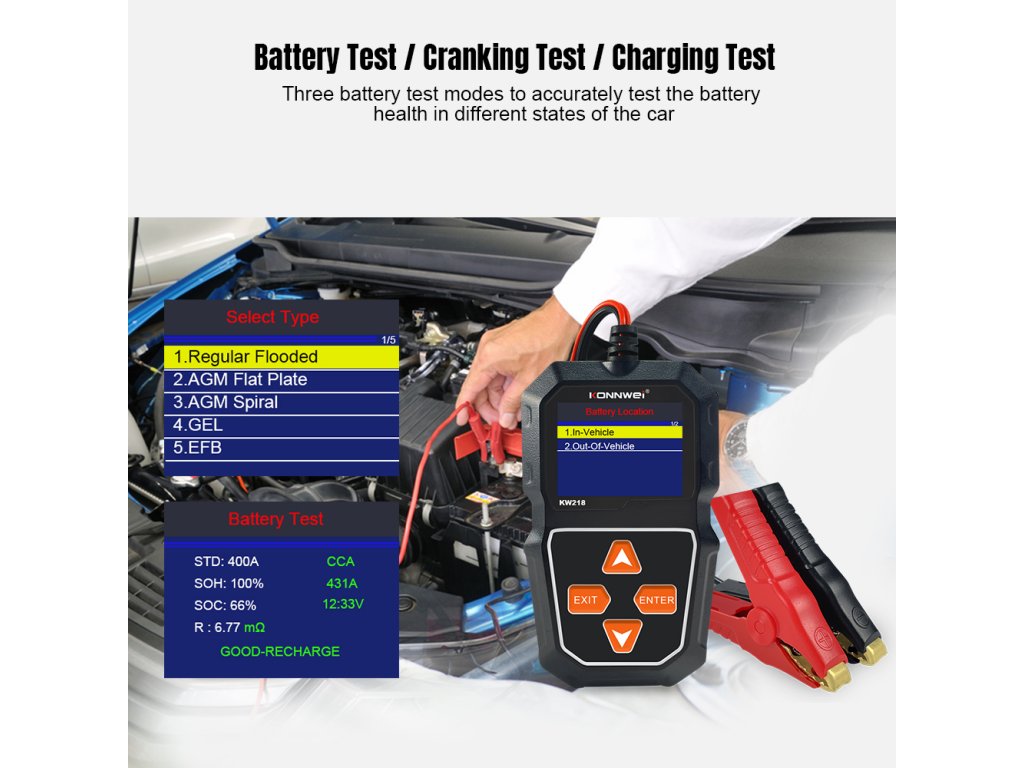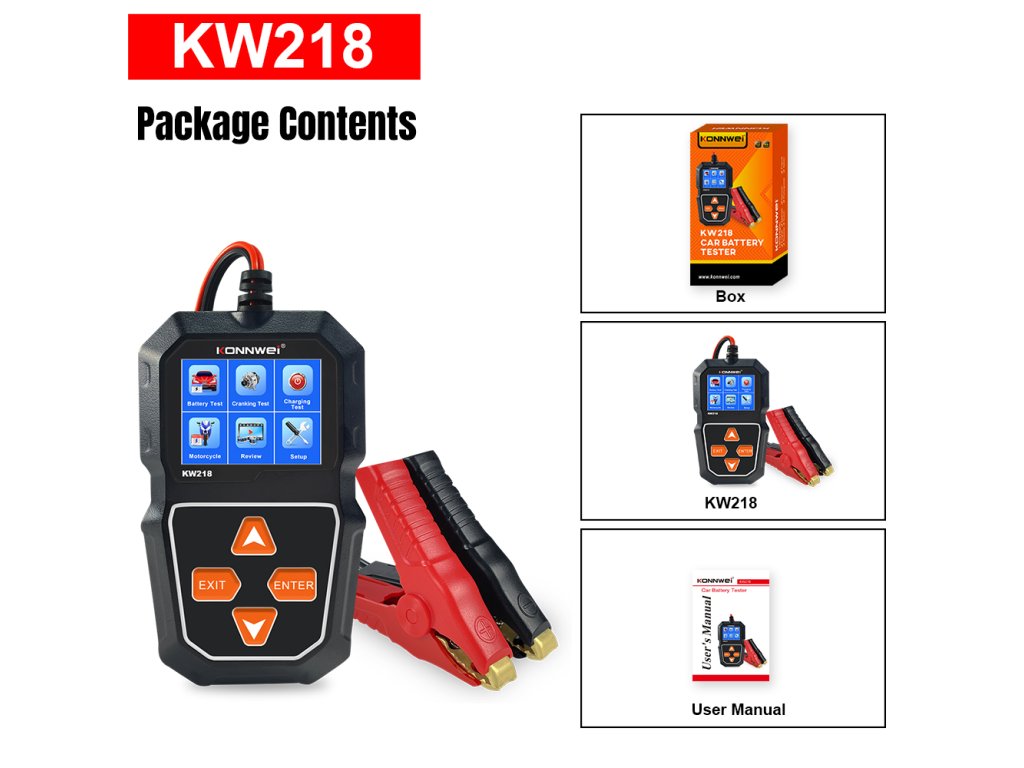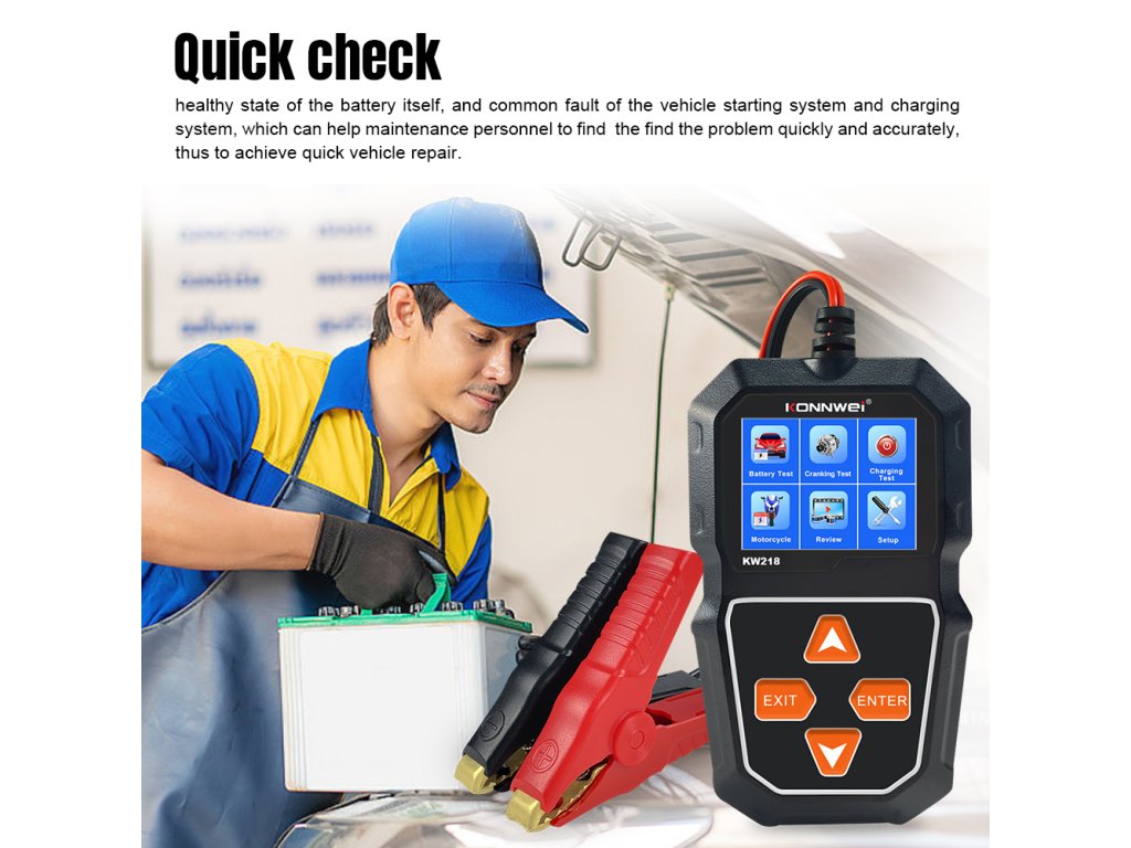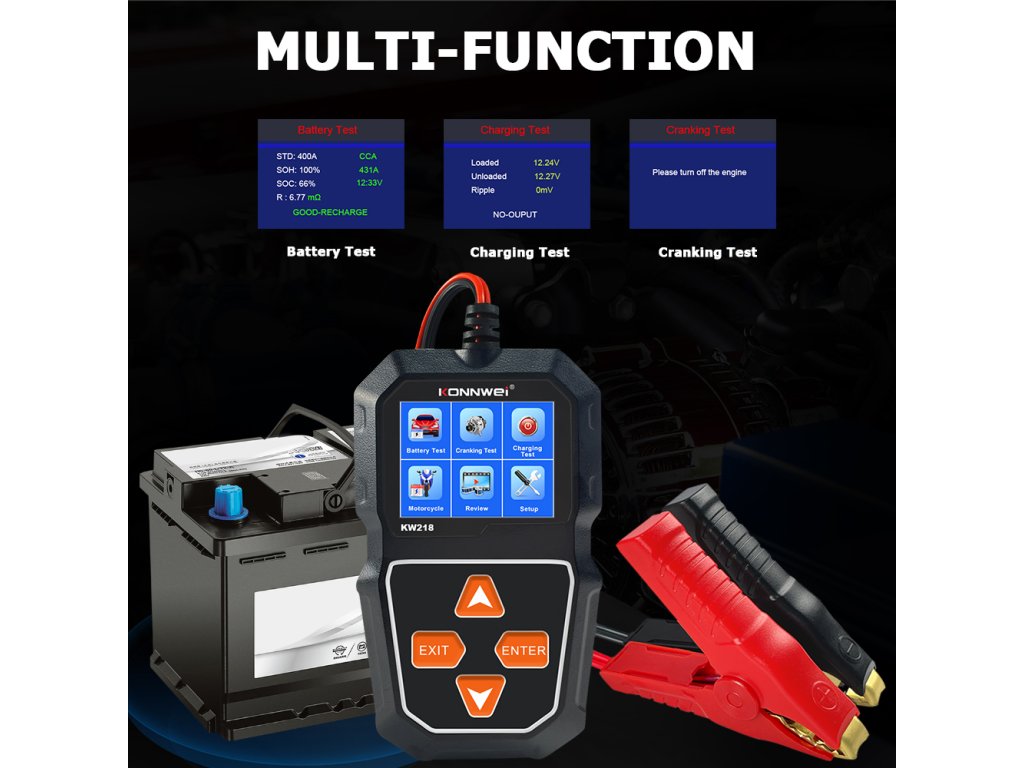 Merilnik baterij Konnwei KW218 je praktično in zanesljivo orodje za preverjanje stanja akumulatorja v razponu napetosti od 6 do 12 V. Omogoča odčitavanje ključnih parametrov, kot so SOC (stopnja napolnjenosti), SOH (stanje zdravja) ter notranja upornost, kar omogoča hitro in natančno oceno stanja baterije. Merilno območje je od 100 do 2000 CCA, vsi podatki pa so prikazani na jasnem LCD zaslonu.