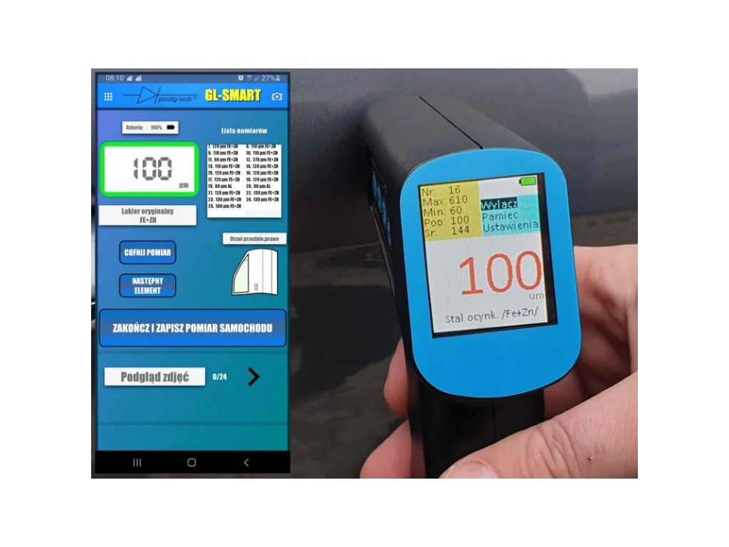 Merilnik debeline barve omogoča natančno merjenje na avtomobilskih pocinkanih jeklenih in aluminijastih pločevinah. Ima zmožnost zaznavanja prisotnosti cinka na jeklu, kar je koristno pri ocenjevanju stanja karoserije. Sferična sonda omogoča merjenje tudi na ukrivljenih površinah. Merilnik je zasnovan tako, da se prilega v pištolsko torbico za enostavno prenašanje.Druga pomembna funkcija je njegova združljivost z mobilnimi telefoni. Merilnik lahko povežete s telefonom s sistemom Android 6 ali novejšim ali iOS različice 14.1 ali novejšim prek aplikacije GL-SMART, ki je na voljo za prenos v ustreznih trgovinah z aplikacijami.