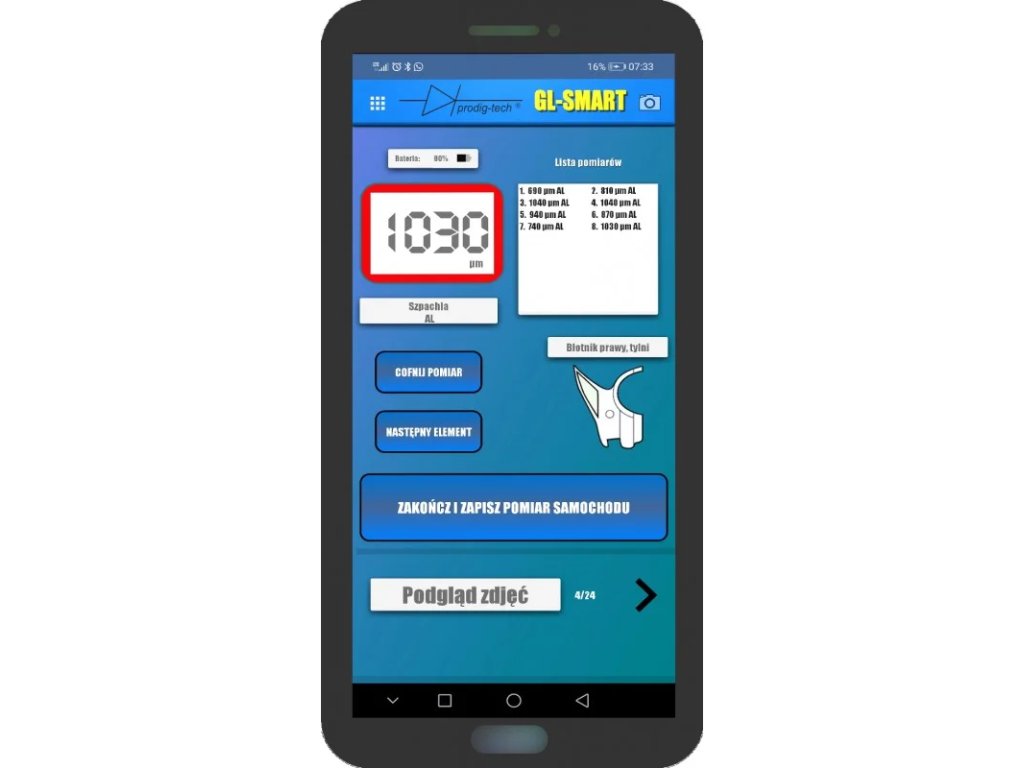 Merilnik debeline barve GL-PRO-SMART ponuja možnost podrobnega merjenja na posameznih delih karoserije avtomobila. V aplikaciji GL-SMART se prikaže grafična razdelitev avtomobila na posamezne segmente. Po izbiri določenega dela karoserije se prikaže podroben pogled in lahko izvedete merjenje na enak način kot v osnovnem načinu merjenja.V profesionalnem načinu lahko poleg tega shranite rezultate meritev v obliki podrobnih poročil. Če imate merilnik v verziji GL-SMART-S, lahko za vsako vozilo dodate do 24 fotografij. Za dodajanje fotografij preprosto kliknite ikono fotoaparata v desnem zgornjem kotu aplikacije. Fotografije se nato shranijo v katalog skupaj z meritvami določenega vozila. Fotografije so shranjene ločeno za vsako testirano vozilo, kar omogoča enostavno in učinkovito sledenje in arhiviranje meritev.