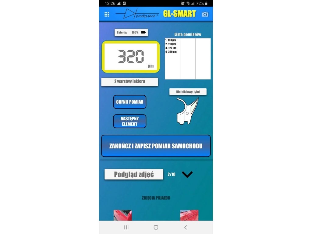 Po aktivaciji te funkcije se prikaže seznam zaznanih merilnikov - iz tega seznama izberite enega. Nato aplikacija preide v osnovni način merjenja. Vendar pa se vam s prehodom v razširjeni prikaz odpre množica dodatnih funkcij: pregledna tabela z vsemi meritvami, grafična prikaz rezultatov meritev in možnost shranjevanja rezultatov v mapo z meritvami.Za izvedbo merjenja morate v merilniku preklopiti na način merjenja preko MENIJA. Po pritrditvi merilnika na karoserijo avtomobila se rezultat merjenja prikaže na LCD zaslonu merilnika in v aplikaciji GL-SMART.