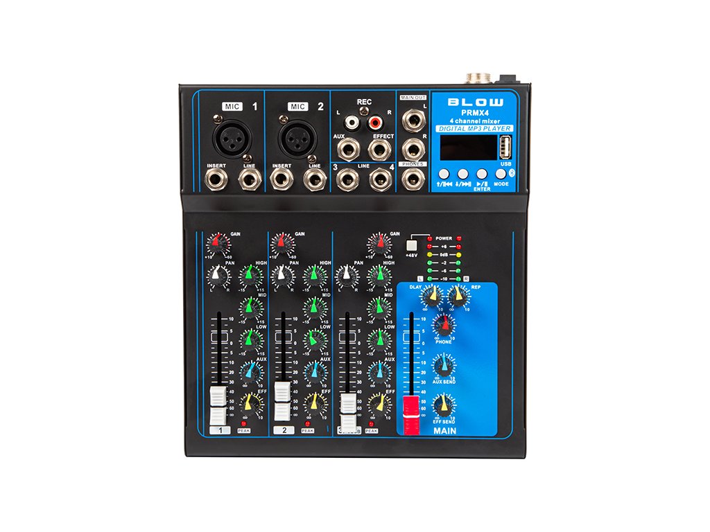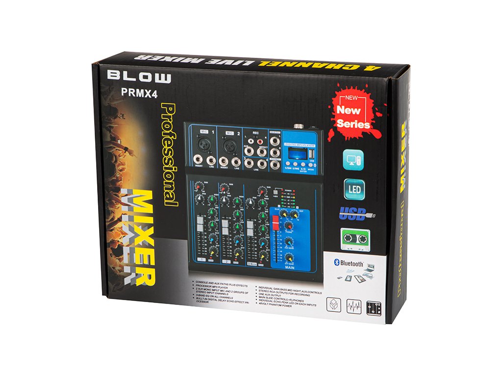 Kompaktni mešalnik PRMX 4 znamke BLOW z naprednimi funkcijami se izkaže na odru, v snemalnem studiu, pa tudi v DJ opremi. Ponuja USB vhod za predvajanje MP3 datotek, echo efekt ter Jack priključek za procesorje efektov.