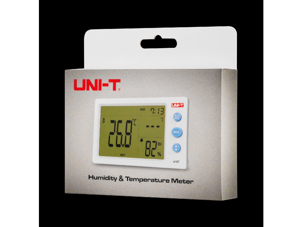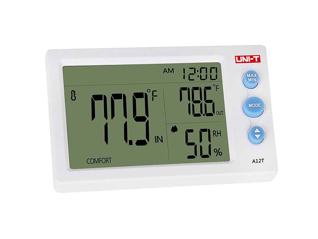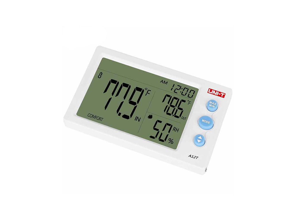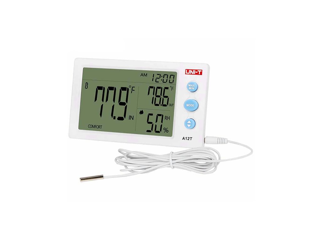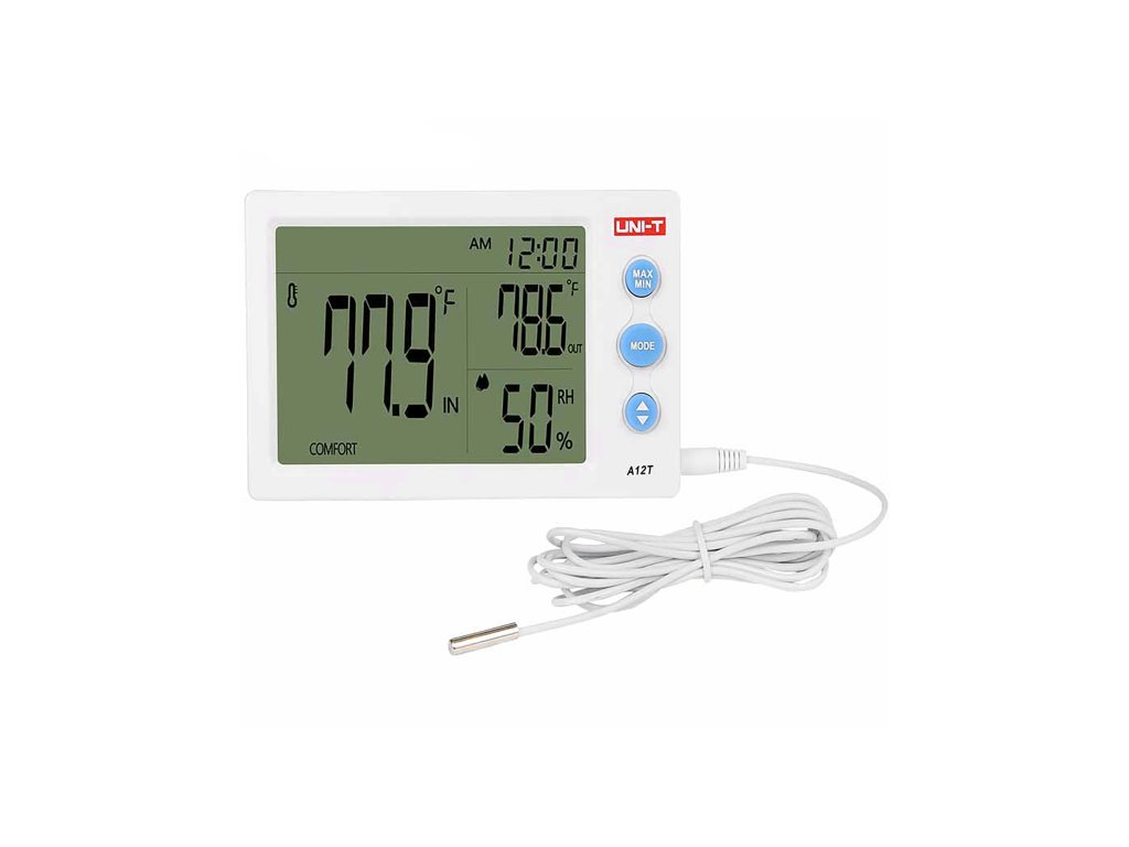 Uni-T A12T ponuja funkcijo spremljanja maksimalnih in minimalnih vrednosti, kar omogoča nadzor ekstremnih pogojev. Vgrajena budilka in ura, ki podpira 12- in 24-urno obliko, povečujeta uporabniško udobje. Zunanji žični senzor omogoča spremljanje temperature in vlažnosti na različnih lokacijah, kar ponuja večjo prilagodljivost pri upravljanju pogojev v različnih delih doma ali pisarne.