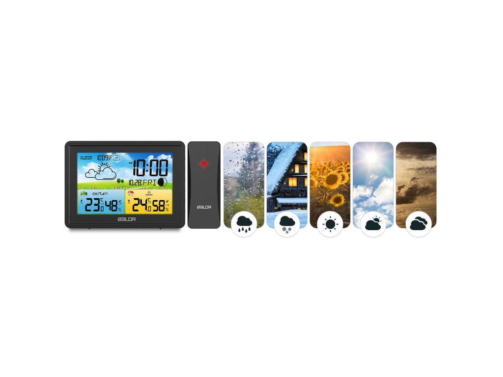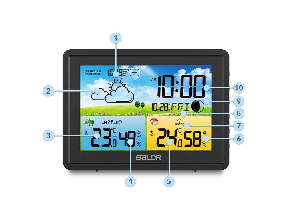 - Z neprekinjenimi meritvami temperature, tlaka in vlažnosti postaja analizira in zagotavlja napoved vremena za naslednjih 12 ur.