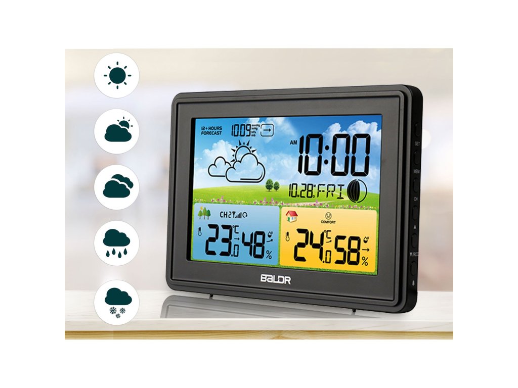 - Meteorološka postaja z vgrajenim higrometrom omogoča nadzor in vzdrževanje ustrezne mikroklime v notranjosti ali zunaj.
