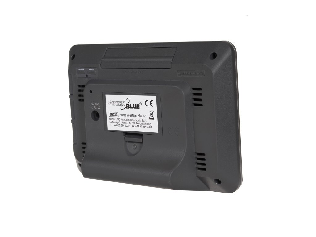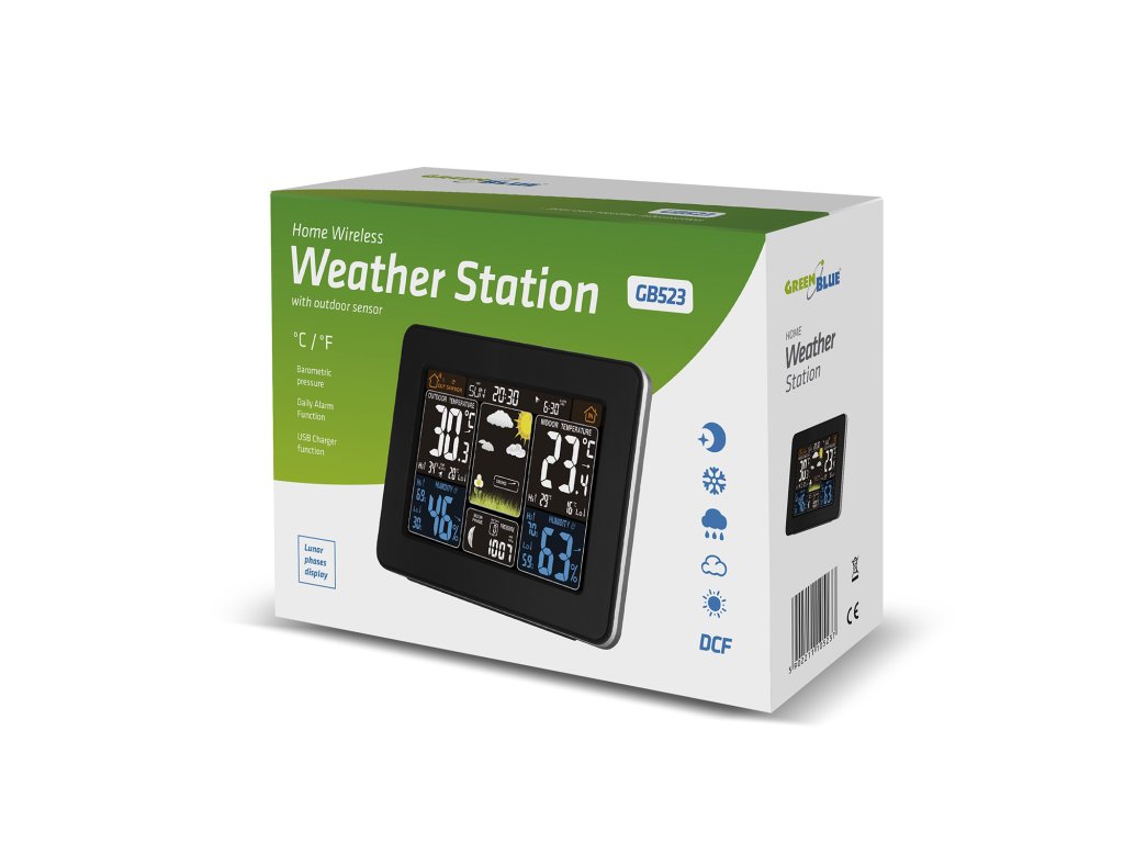 GreenBlue GB523 DCF brezžična barvna vremenska postaja GreenBlue GB523 DCF faze mesecaModerna vremenska postaja z velikim, enostavno berljivim zaslonom. Zanesljiva, elegantna in enostavna za uporabo vremenska postaja GB523! Brezžični senzor zunanje temperature z dosegom do 60 m. Visoka kakovost, zagotovljena s strani priznanega proizvajalca.