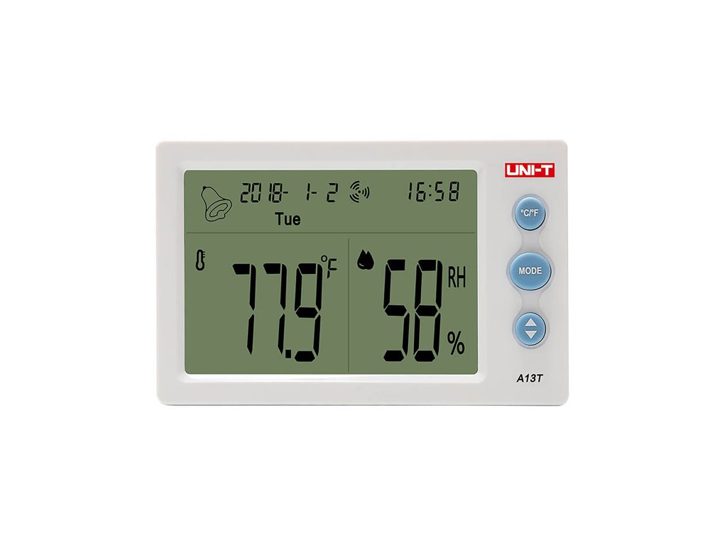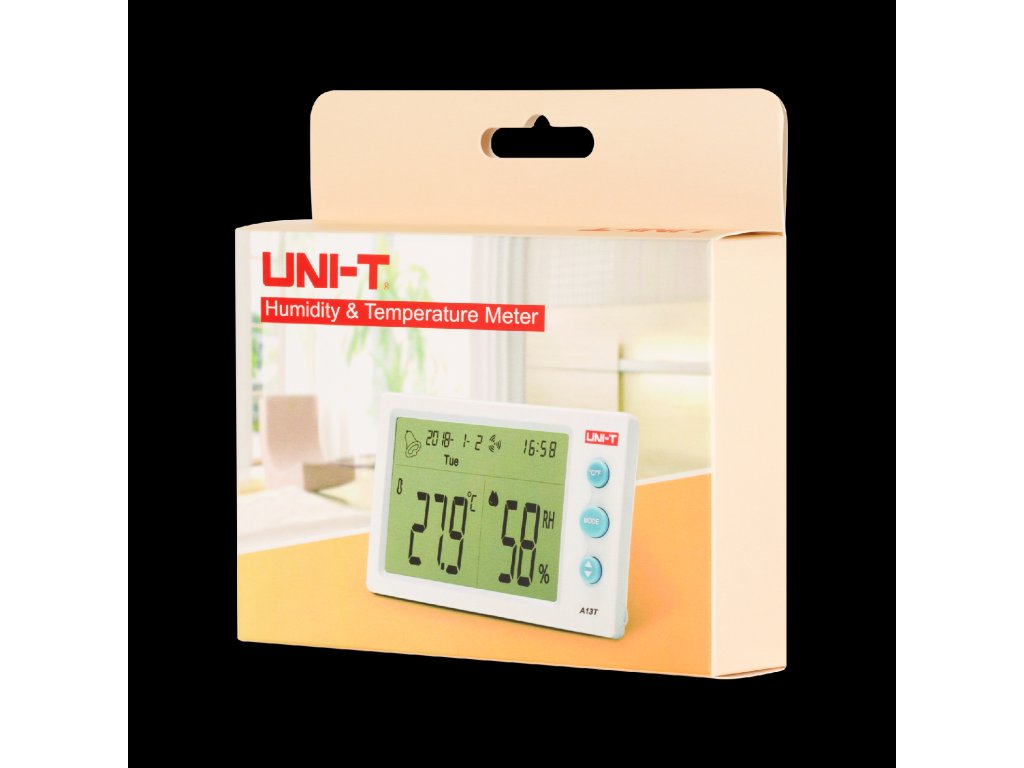 Vremenska postaja Uni-T A13T ne meri samo temperature in vlažnosti, ampak ponuja tudi dodatne funkcije, ki povečujejo njeno vsestranskost. Ima funkcijo koledarja ter alarma, kar omogoča enostavno sledenje datumom in opomnikom. Ura v 12/24-urnem načinu se prilagodi individualnim potrebam uporabnika. Funkcija pomnilnika najvišje in najnižje temperature omogoča sledenje spremembam temperature v določenem času.