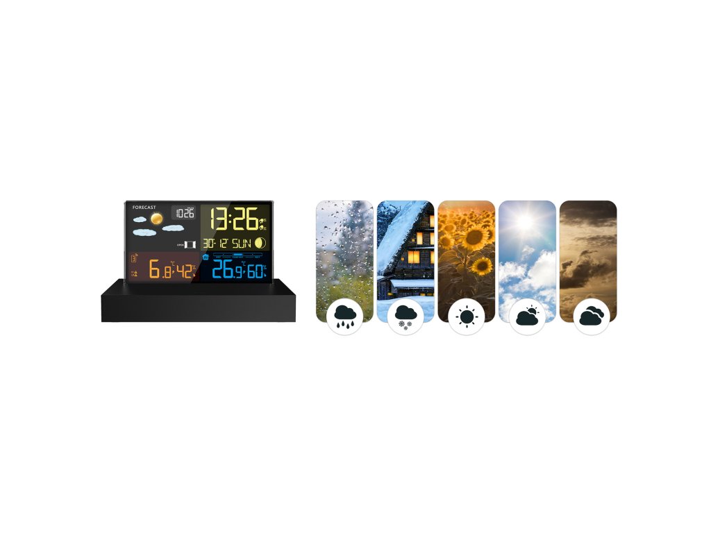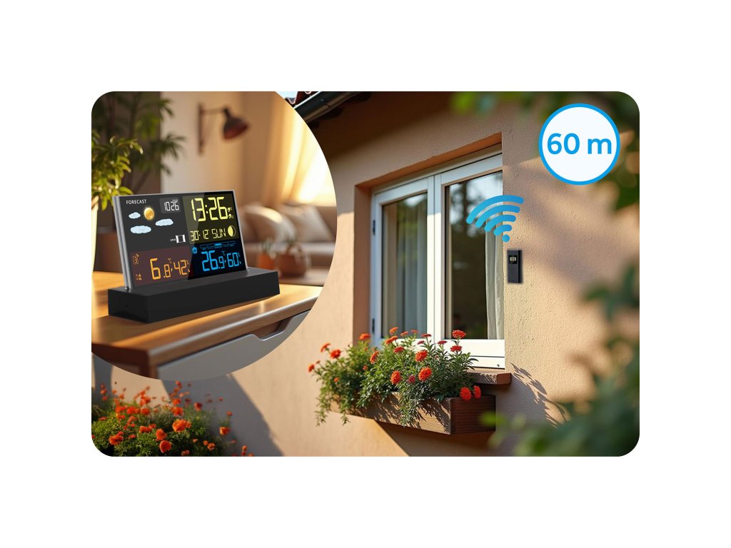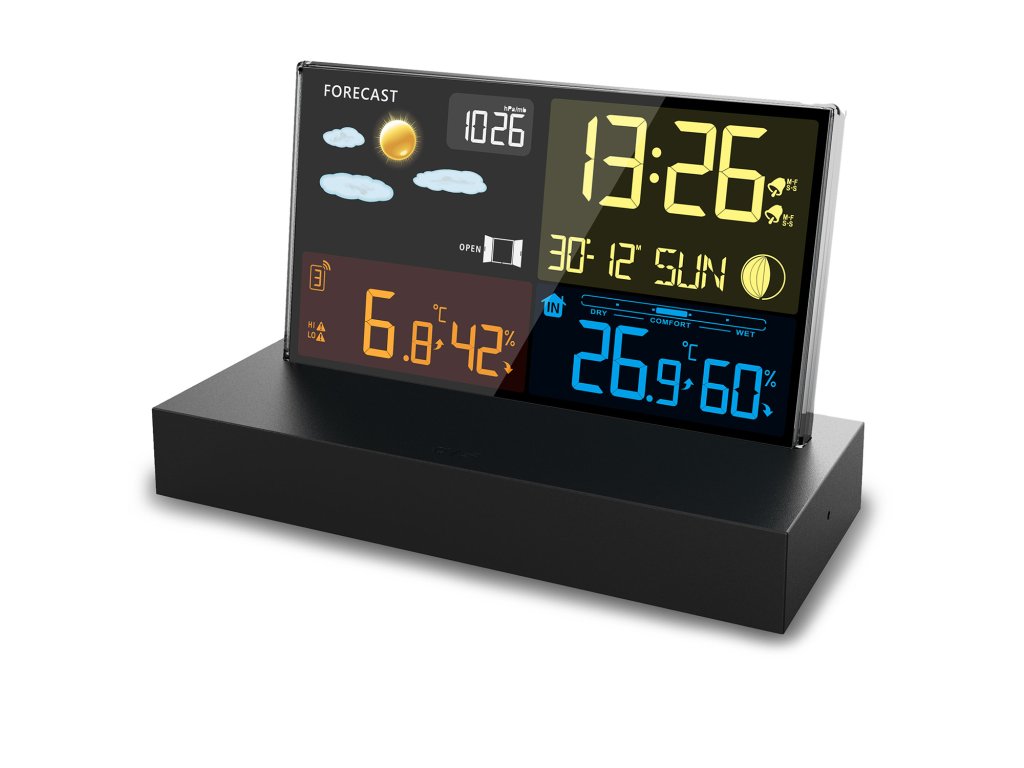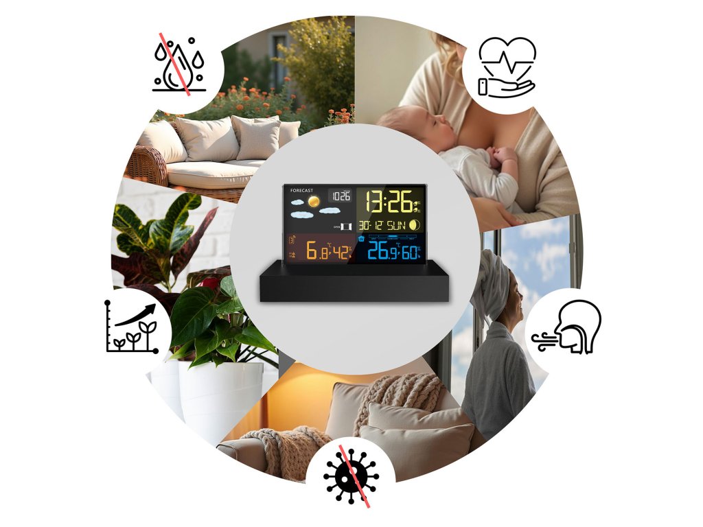 - Vremenska postaja z integriranim higrometrom omogoča nadzor in vzdrževanje ustreznih mikroklimatskih pogojev v prostorih.