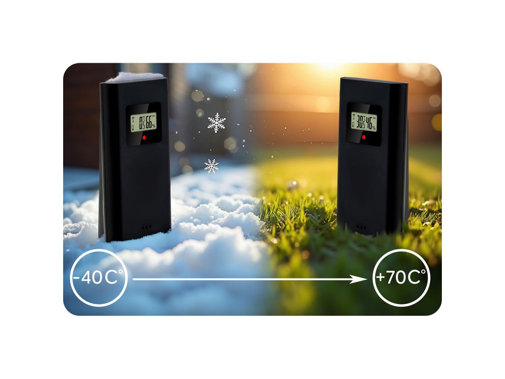 - Brezžični zunanji senzor z dosegom do 60 metrov in tremi kanali.