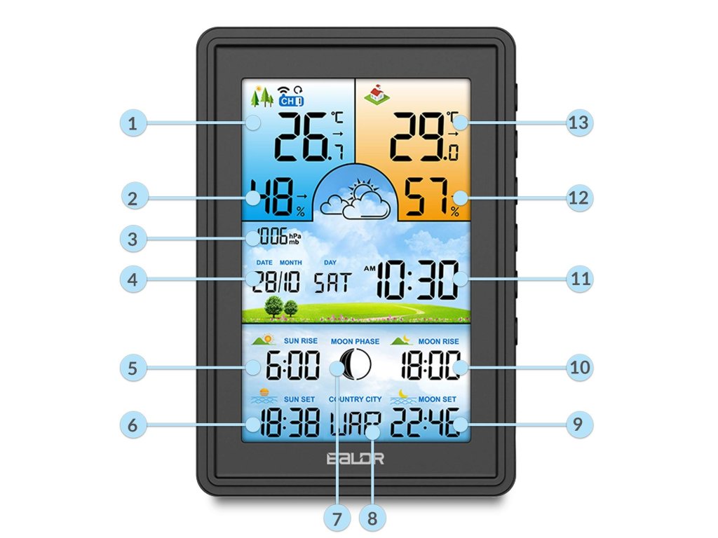 Naprava se samodejno sinhronizira s senzorjem in omogoča priključitev dodatnih senzorjev. Hkrati prikazuje meritve s postaje in senzorja, ki jih lahko enostavno odčitate na barvnem zaslonu.
