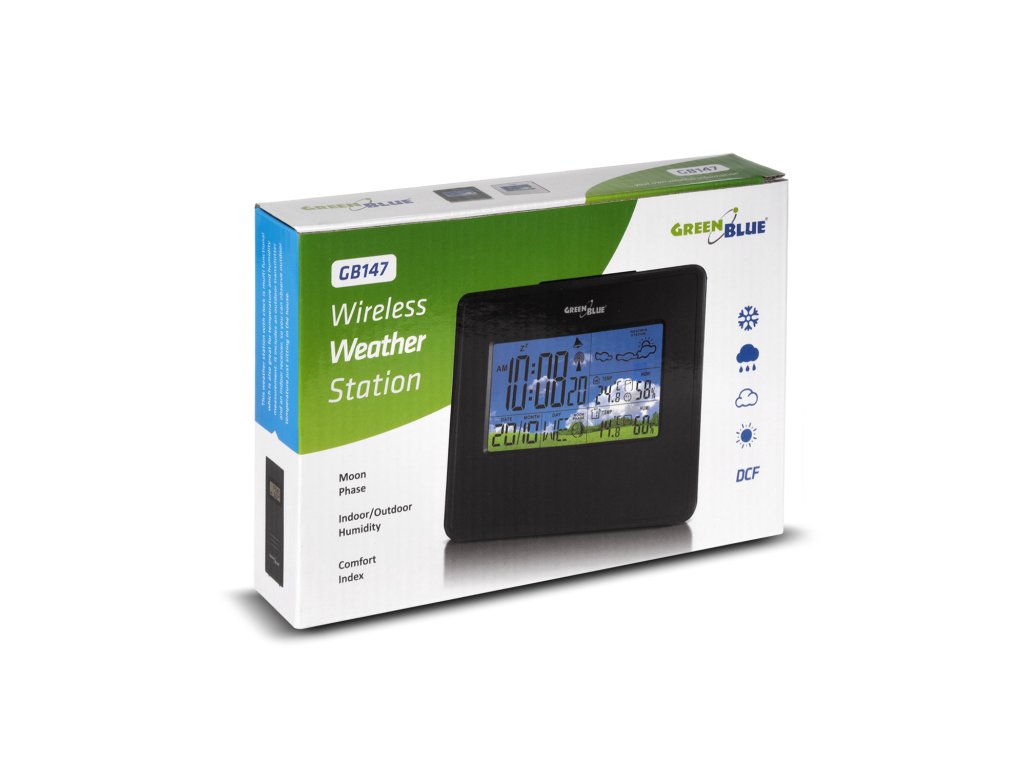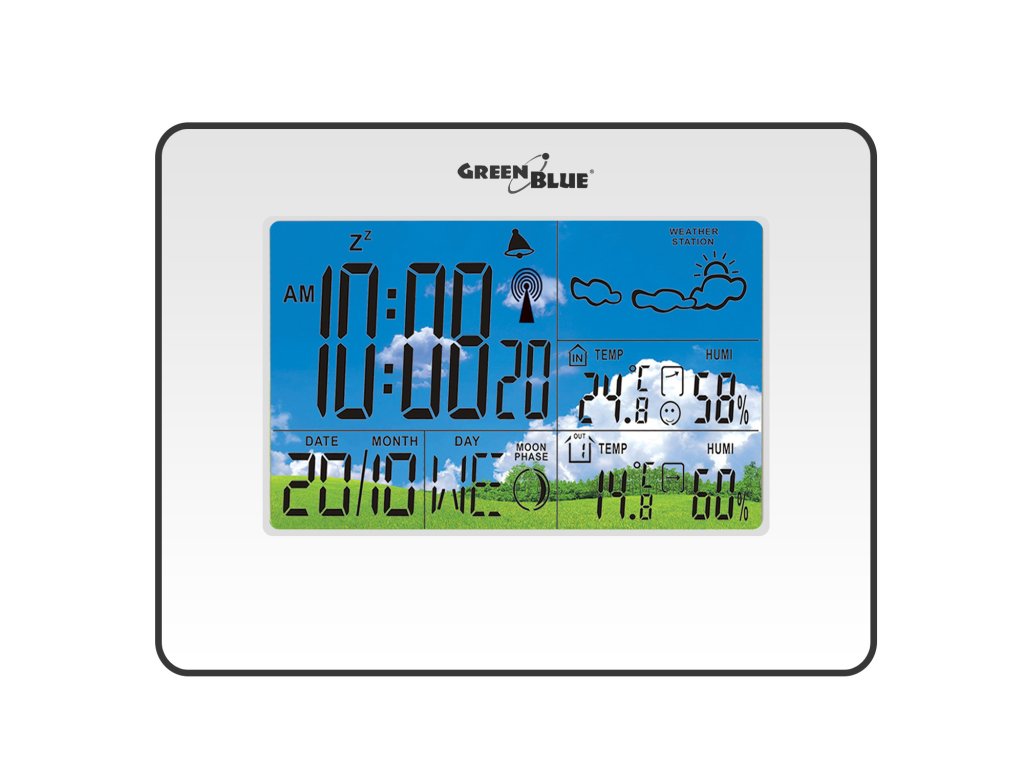 URZ0871 je moderná meteorologická stanica Green Blue s meraním teploty a vlhkosti. Zariadenie je vybavené aj indikátorom úrovne komfortu, grafickou predpoveďou počasia, hodinami a kalendárom. Všetky tieto informácie sa zobrazujú na ľahko čitateľnom podsvietenom displeji. Okrem toho je stanica vybavená systémom DFC, ktorý umožňuje dennú synchronizáciu s frankfurtskými atómovými hodinami, takže hodinky zabudované v zariadení ukazujú presný čas.