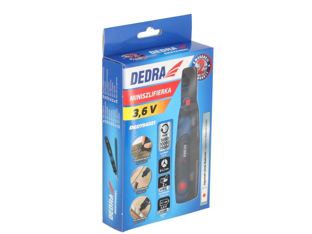 Vgrajena baterija s kapaciteto 600 mAh zagotavlja neprekinjeno delovanje in, kar je pomembno, mobilnost stroja. Mini brusilnik DED7940Z1 je opremljen z motorjem znamke JAPAN Mabuchi, katere tovarna je največja tovarna majhnih motorjev na svetu in letno proizvede 1,4 milijarde motorjev! Stroj je lahek, praktičen in udoben za uporabo, funkcija samodejnega izklopa v primeru zagozditve obdelovanca pa poveča varnost pri delu.