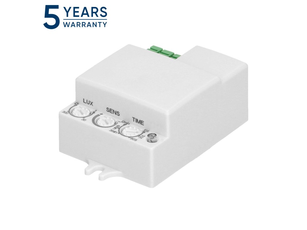 Mini mikrovalovni senzor gibanja je napredna naprava, ki združuje funkcionalnost in vsestranskost. Ta model, opremljen z visokofrekvenčnim senzorjem, ima širok kot pregleda 360° in horizontalni kot zaznavanja 180°, kar popolnoma pokriva nadzorovano območje.Naprava deluje pri 5,8 GHz in zazna gibanje pri hitrostih med 0,6 in 1,5 m/s. Senzor je opremljen z nastavitvijo občutljivosti in svetlobne intenzivnosti <3-2000 lux, in order to adapt the sensor's operation to the prevailing lighting conditions. The sensitivity adjustment allows to change the motion detection distance for the sensor to respond. The device also allows to adjust the switch-on time in the range between 10s-12min.