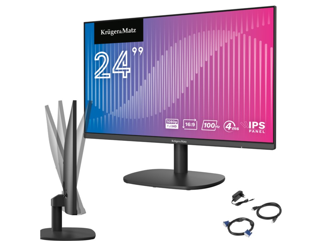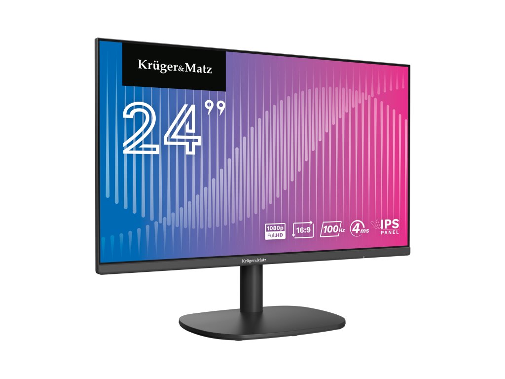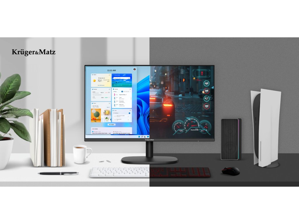 Monitor Kruger&Matz je opremljen z 24-palčnim zaslonom z ločljivostjo Full HD, ki ponuja popolno sliko ne glede na to, ali igrate igre, gledate film ali delate. Uporaba tankih robov okrog zaslona dodatno povečuje vidno območje, kar vam omogoča, da se osredotočite na najpomembnejše.
