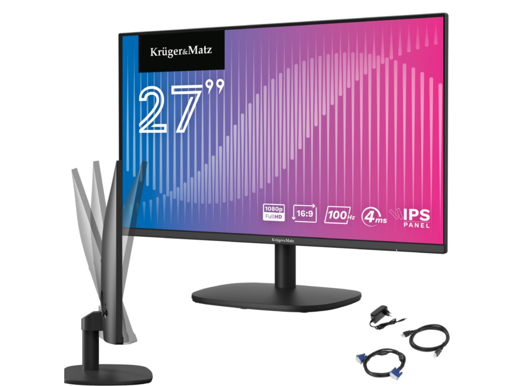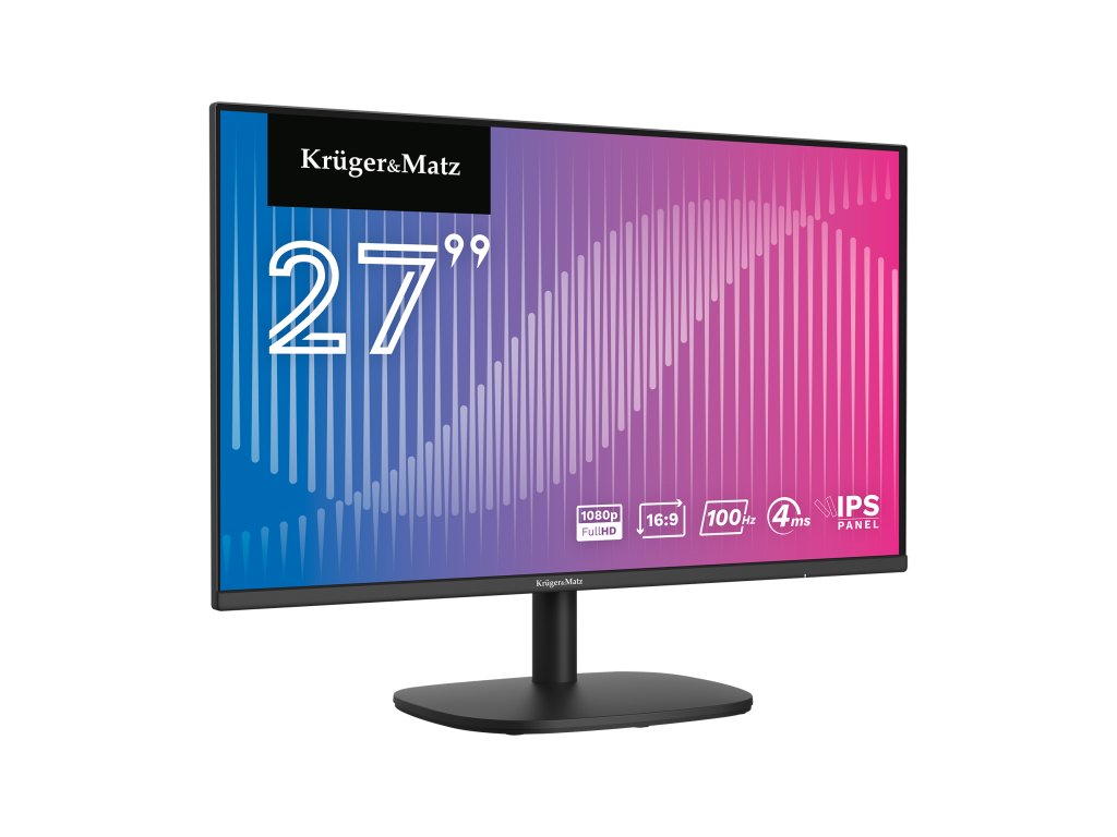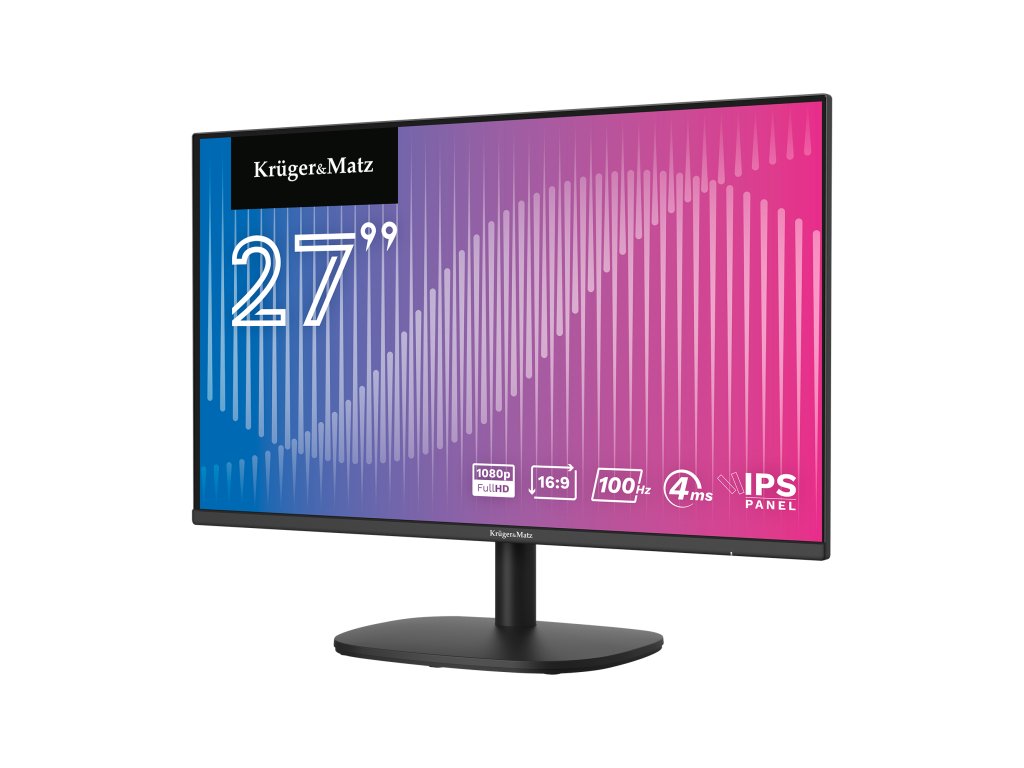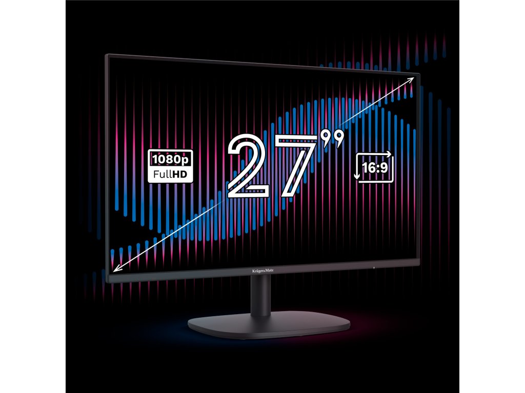 Monitor Kruger&Matz je opremljen s 27-palčnim zaslonom z ločljivostjo Full HD, ki ponuja odlično sliko ne glede na to, ali igrate igre, gledate film ali delate. Tanke okvirje okoli zaslona dodatno povečajo vidni prostor, kar vam omogoča, da se osredotočite na tisto, kar je najpomembnejše.