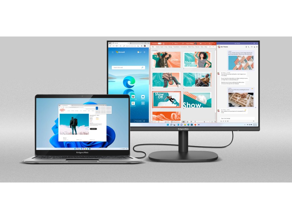 Fleksibilnost in vsestranskost pri uporabi monitorja Kruger&Matz zagotavljata vmesnika HDMI in VGA. Z njima boste zlahka povezali napravo z večino prenosnikov ali namiznih računalnikov.