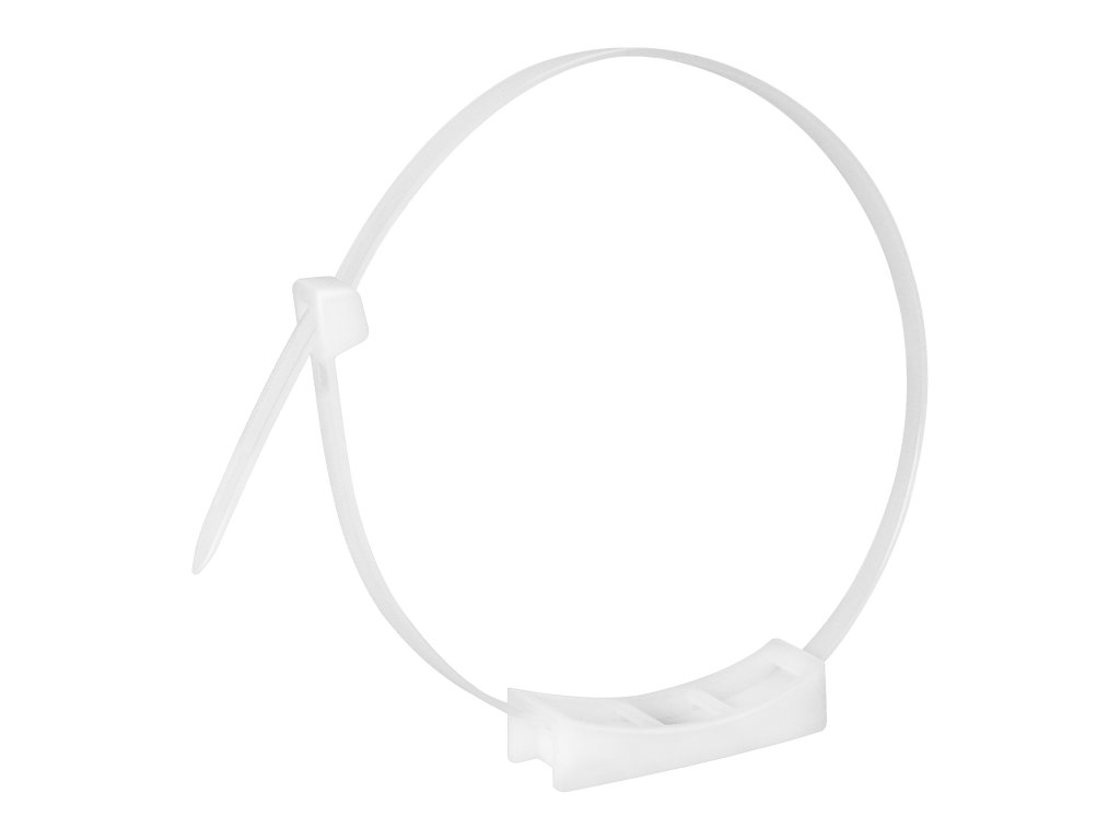 Univerzalno držalo za cevi, ki omogoča namestitev cevi poljubnega premera. Edina omejitev je dolžina kabelske vezice, ki jo imate.Bele barve.