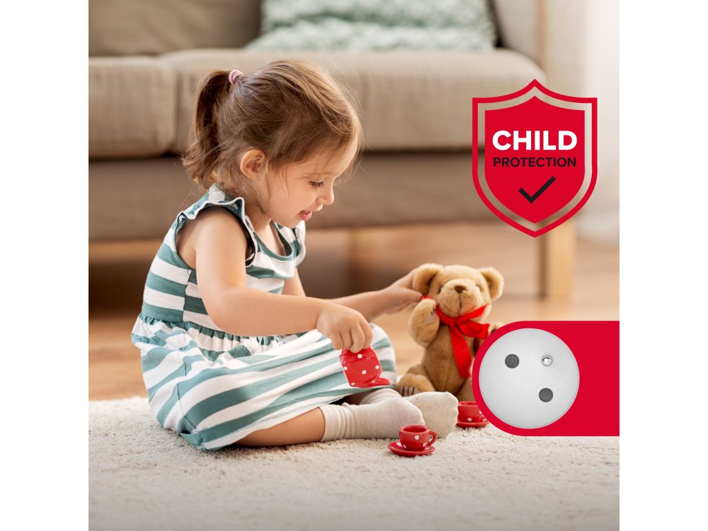 Razdelilni kabel Rebel je opremljen z vgrajenimi zaščitnimi prevlekami za stike v omrežnih vtičnicah. Tako učinkovito ščiti zdravje in življenje najmlajših, s tem da jih ščiti pred vstavljanjem prstov ali drugih predmetov.