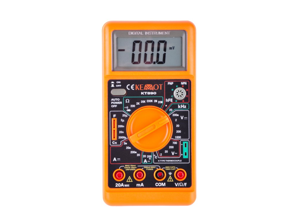 MERILNA OBMOČJA Enosmerna napetost DC: 200 mV/2 V/20 V/200 V/1000 V; ±(0,5%+1) Izmenična napetost AC: 2 V/20 V/200 V/700 V; ±(0,8%+3) Enosmerni tok DC: 2 mA/20 mA/200 mA/20 A; ±(0,8%+1) Izmenični tok AC: 200 mA/20 A; ±(2%+3) Upor: 200 Ohm/2 kOhm/20 kOhm/200 kOhm/2 MOhm/20 MOhm; ±(0,8%+1) Kapaciteta: 2000 pF/20 nF/200 nF/2 µF/20 µF; ±(2,5%+3) Temperatura: -40-1000°C; ±(0,75%+3) Frekvenca: 20 kHz; ±(1%+1) Merjenje hFE tranzistorjev Preverjanje neprekinjenosti vezja Preskus diod DODATNE FUNKCIJE Ročna sprememba merilnih območij Kazalnik nizke ravni baterije Samodejni izklop Največji odčitek: 2000 SPLOŠNE ZNAČILNOSTI Napajanje: baterija 9 V (6F22) Velikost zaslona: 27 x 60 mm Dodatki: baterija, merilni kabli, sonda za merjenje temperatureMERILNA OBMOČJA