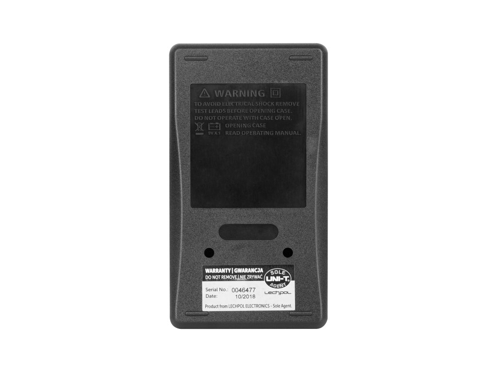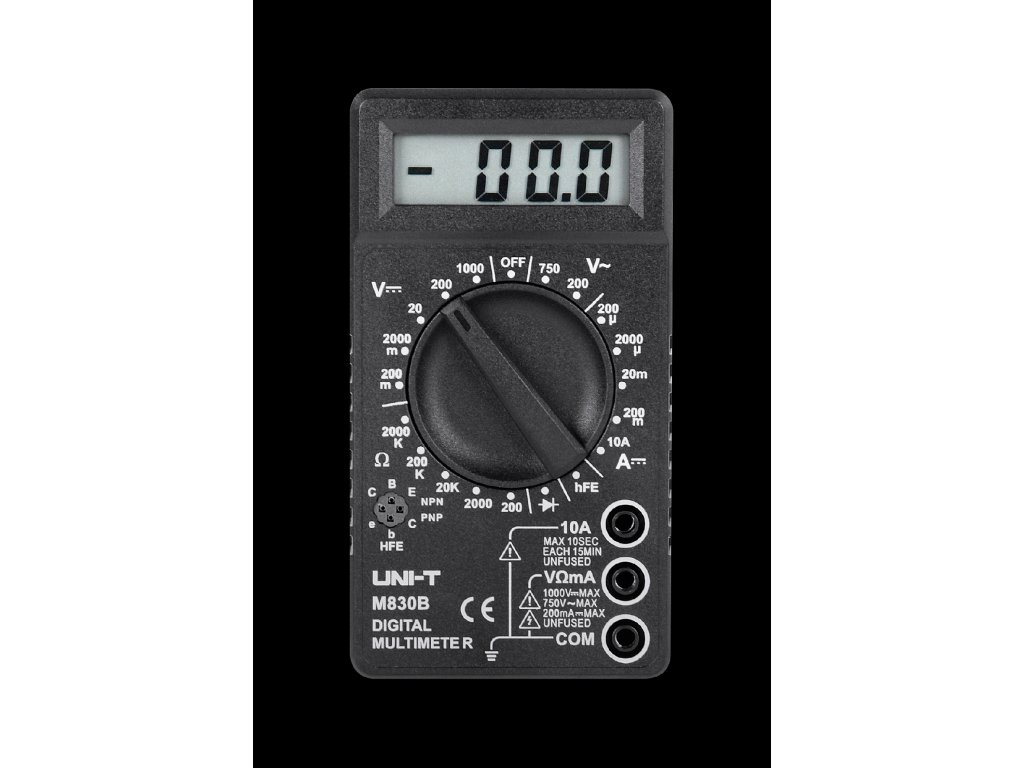 MERILNA OBMOČJA: Enosmerna napetost DC: 200 mV / 2000 mV / 20 V / 200 V / 1000 V ±(1,5%+5) Izmenična napetost AC: 200 V / 750 V ±(2%+10) Enosmerni tok: 200 µA / 2000 µA / 20 mA / 200 mA / 10 A ±(2%+10) Odpornost: 200 Ohm / 2000 Ohm / 20 kOhm / 200 kOhm / 2000 kOhm; ±(2%+10) Merjenje hFE tranzistorjev Testiranje diod DODATNE FUNKCIJE Ročna sprememba merilnih območij Indikator nizkega nivoja baterije SPLOŠNE ZNAČILNOSTI Največji prikaz: 2000 Napajanje: Baterija 9 V (6F22) Vzorčenje: pribl. 3/s Poraba toka: pribl. 5 mA Pripomočki: baterija, merilni kabliMERILNA OBMOČJA: