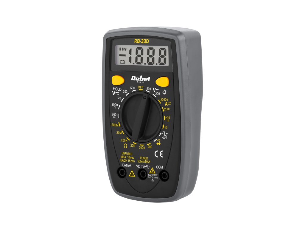 Univerzalni merilnik REBEL RB-33D je natančno merilno orodje, ki se odlično izkaže tako v domači kot profesionalni uporabi. Zaradi širokega nabora funkcij in robustne konstrukcije je RB-33D nepogrešljiv pri diagnostiki in servisiranju elektronskih naprav ter električnih inštalacij.
