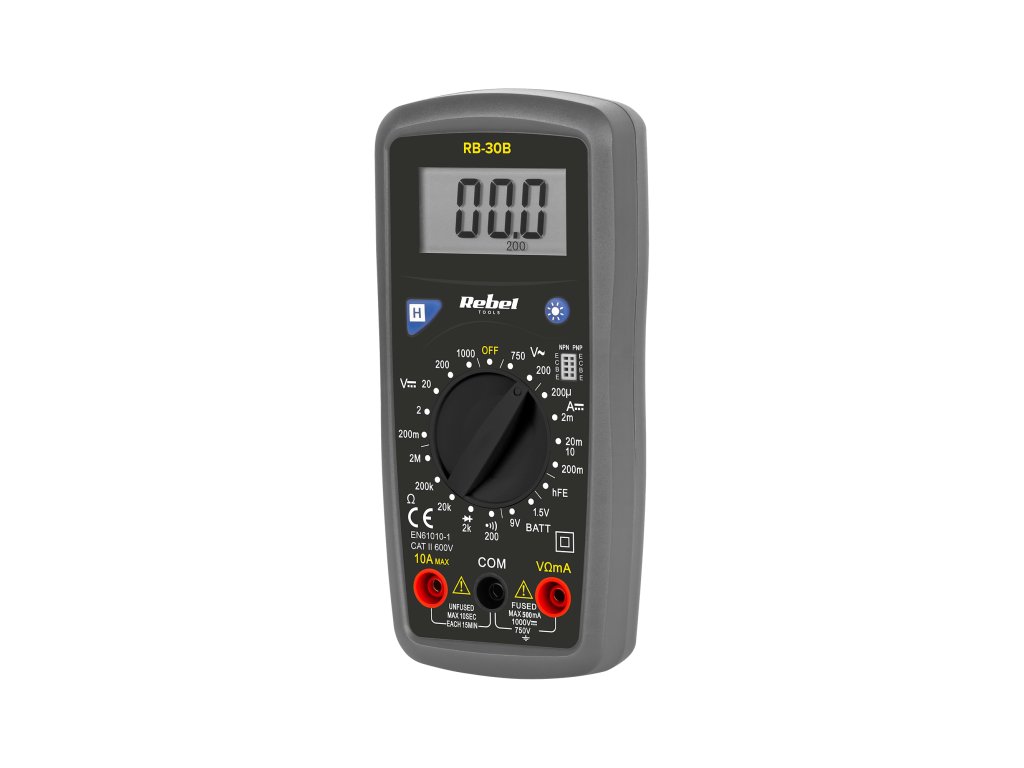 REBEL RB-30B ponuja široke merilne razpone za različne električne parametre. Merjenje enosmerne napetosti (DC) od 200 mV do 1000 V ter izmenične napetosti (AC) do 750 V omogoča delo z raznolikimi tokokrogi. Merilnik podpira tudi merjenje enosmernega toka do 10 A in upornosti do 2 MOhm, kar ga naredi za vsestransko orodje za analizo in popravilo električnih naprav. Poleg tega funkcije testiranja diod, testa baterij (1,5 V in 9 V), preverjanja tranzistorjev hFE ter neprekinjenosti tokokrogov povečujejo njegovo funkcionalnost.