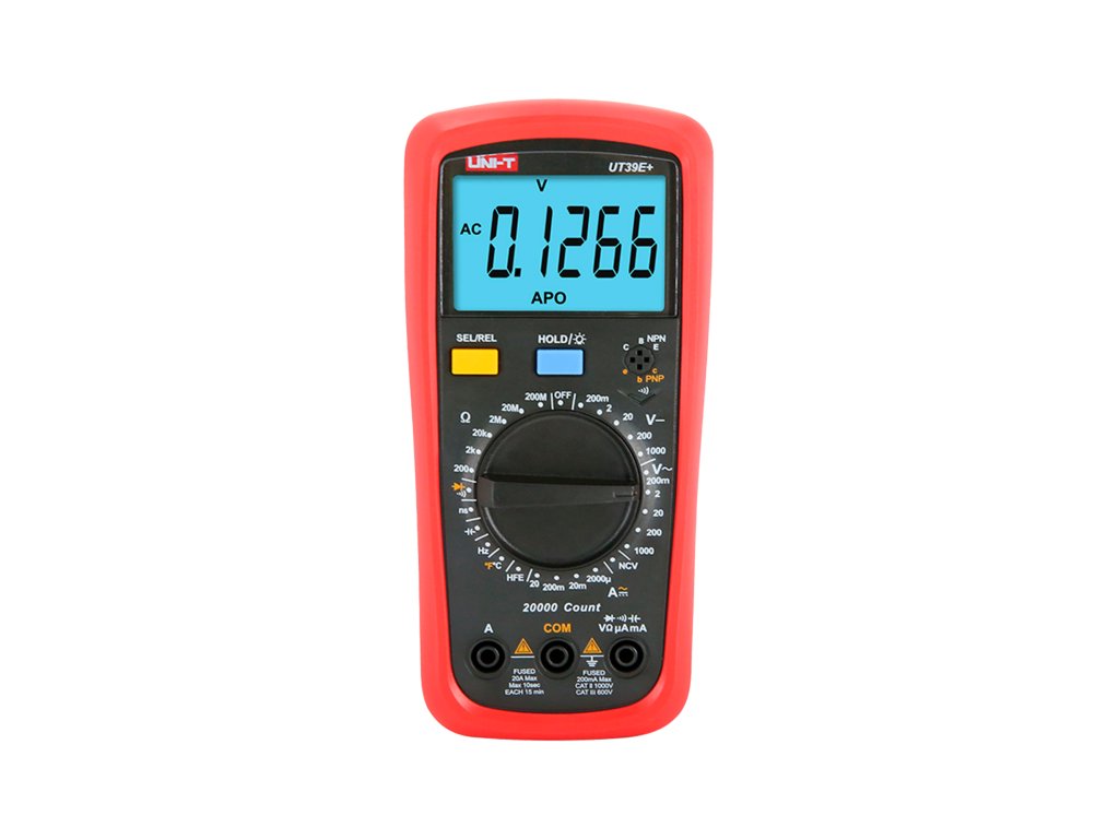 UT39E+ omogoča natančno merjenje enosmerne napetosti do 1000 V in izmenične napetosti do 1000 V, kot tudi toka enosmernega in izmeničnega toka do 20 A. Poleg tega merilnik ponuja funkcije merjenja upornosti do 200 MOhm, kapacitivnosti do 2000 µF in frekvence v razponu od 10 Hz do 2 MHz. Zahvaljujoč možnosti merjenja temperature od -40°C do 1000°C je naprava izjemno vsestranska in se izkaže v širokem spektru uporabe.