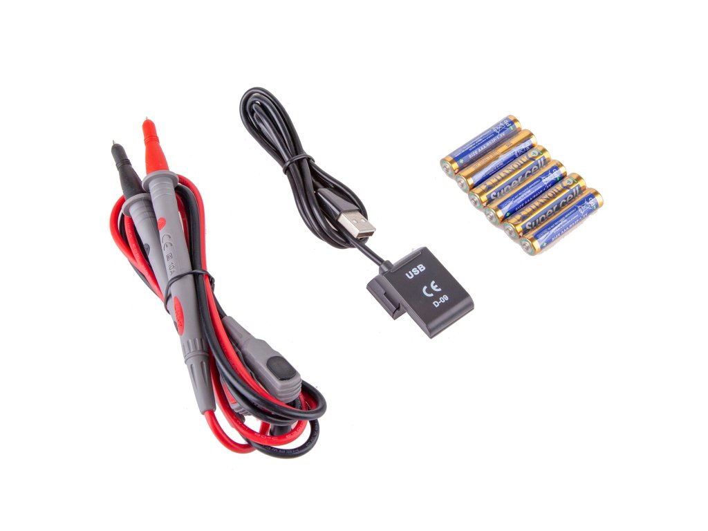 Pribor: baterije, merilni kabli, USB kabel, etui