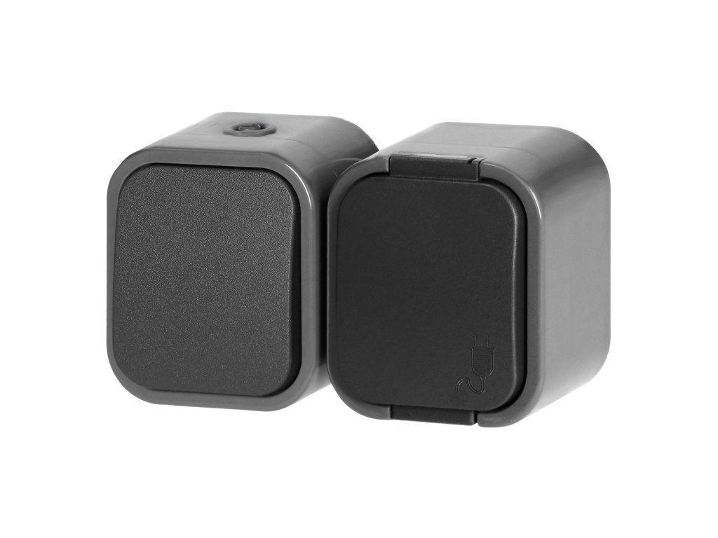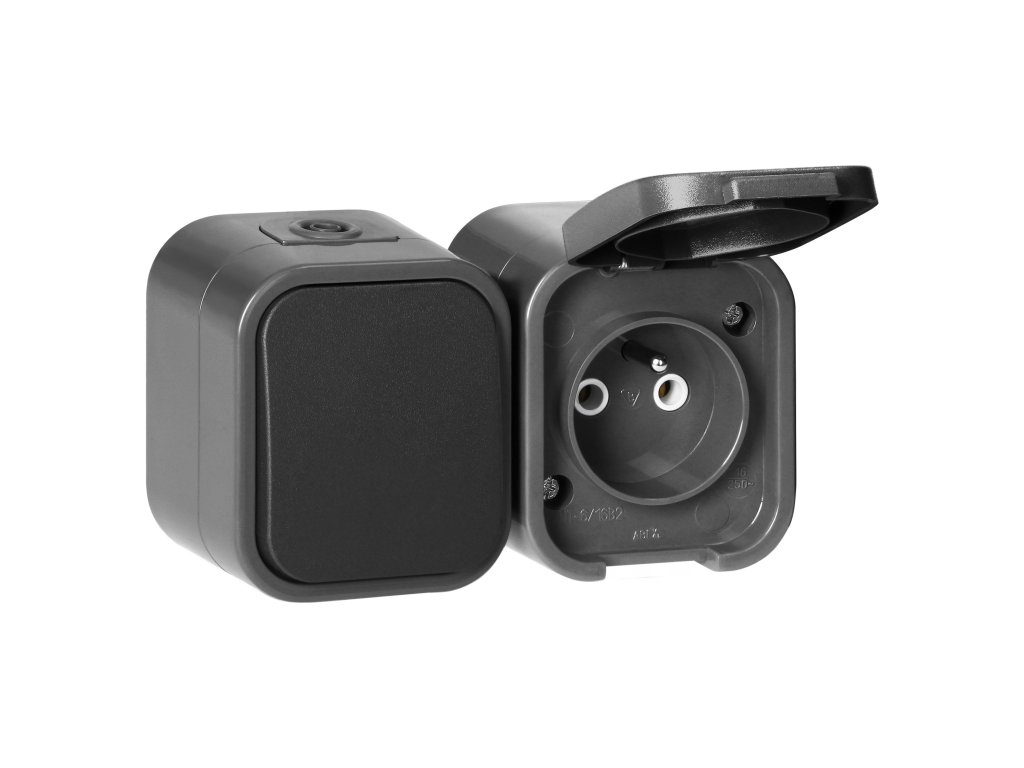 Nadzidni enopolni stikalo + Enojna vtičnica 2P+E B2, IP54, GWN-B2, siva/črna