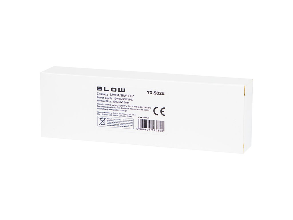 Napajalnik primeren za LED inštalacije. Ima vodoodporno zaščito IP67, zato je idealna rešitev na mestih, kjer je naprava izpostavljena vodi in prahu. Odlično se obnese med drugim v kopalnicah, kuhinjah, na terasah, nadstreških, reklamnih panojih in na mnogih drugih mestih. Poleg tega so napajalniki BLOW opremljeni z zaščitami pred kratkim stikom, preobremenitvijo in toplotno zaščito.