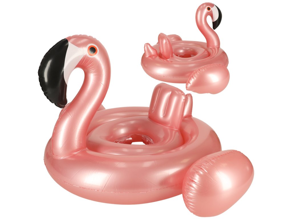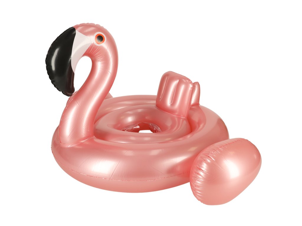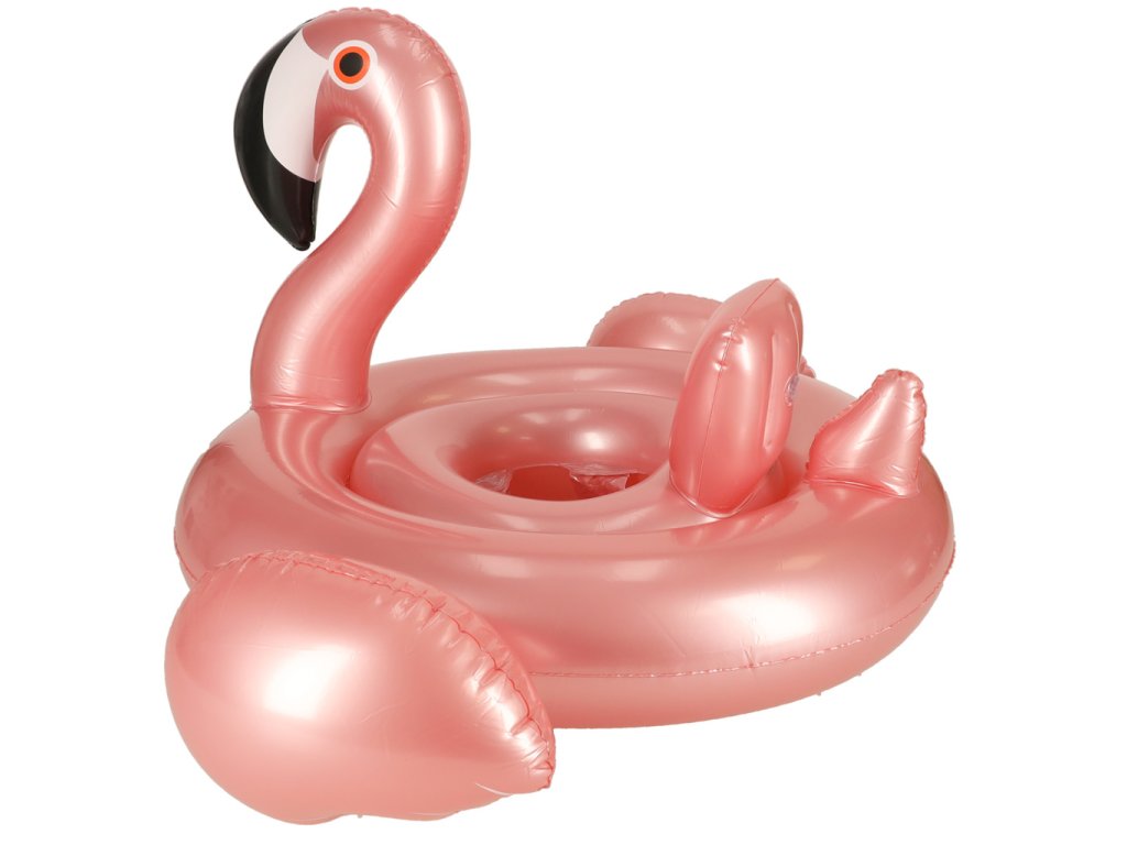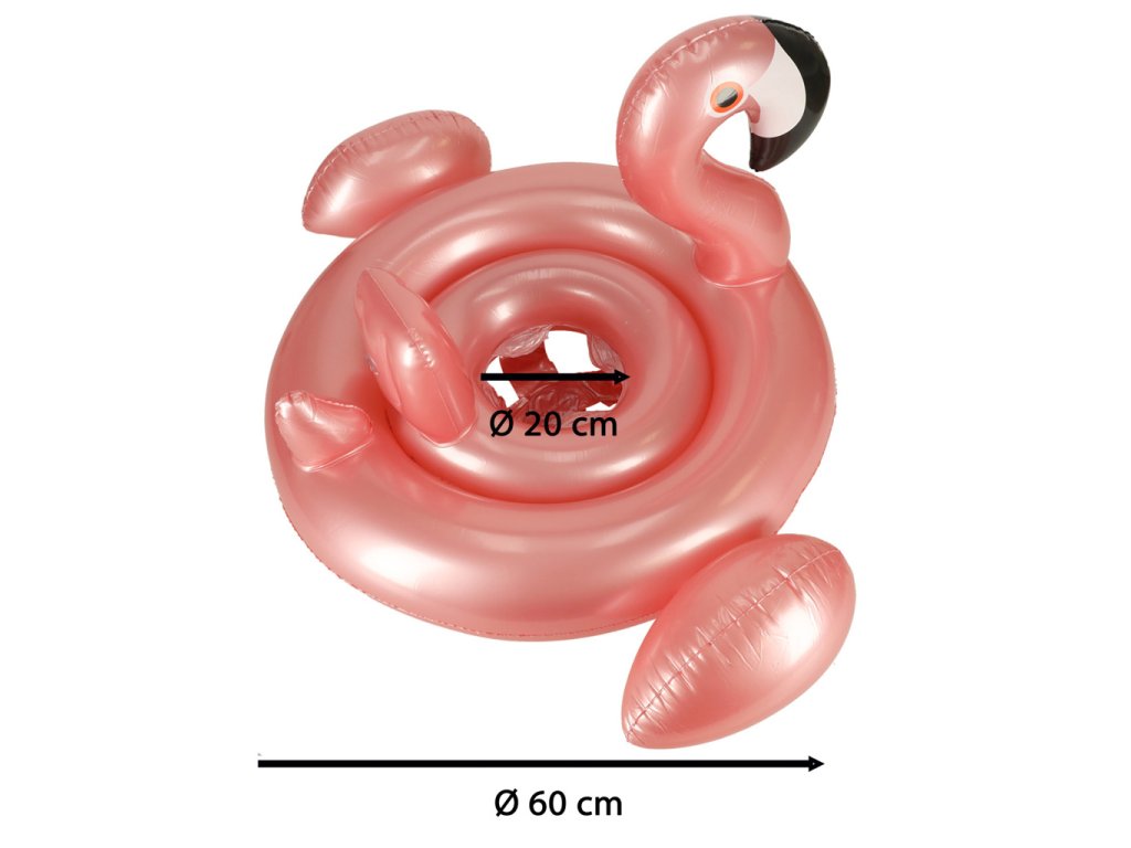 Roza napihovalni krog v obliki flaminga za otroke s sedežem, narejen iz kakovostne PVC plastike, ki zagotavlja vzdržljivost.