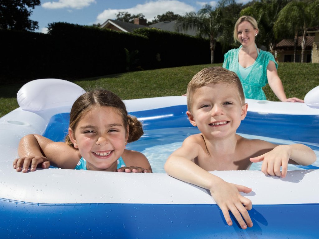 Družinski bazen Bestway z vgrajenimi sedeži ne sme manjkati na nobenem vrtu. Odlikuje ga stabilna konstrukcija, ki jo sestavljata dva napihljiva obroča. Stranske stene služijo kot udobno naslonjalo in imajo poleg tega prijetno in mehko površino.