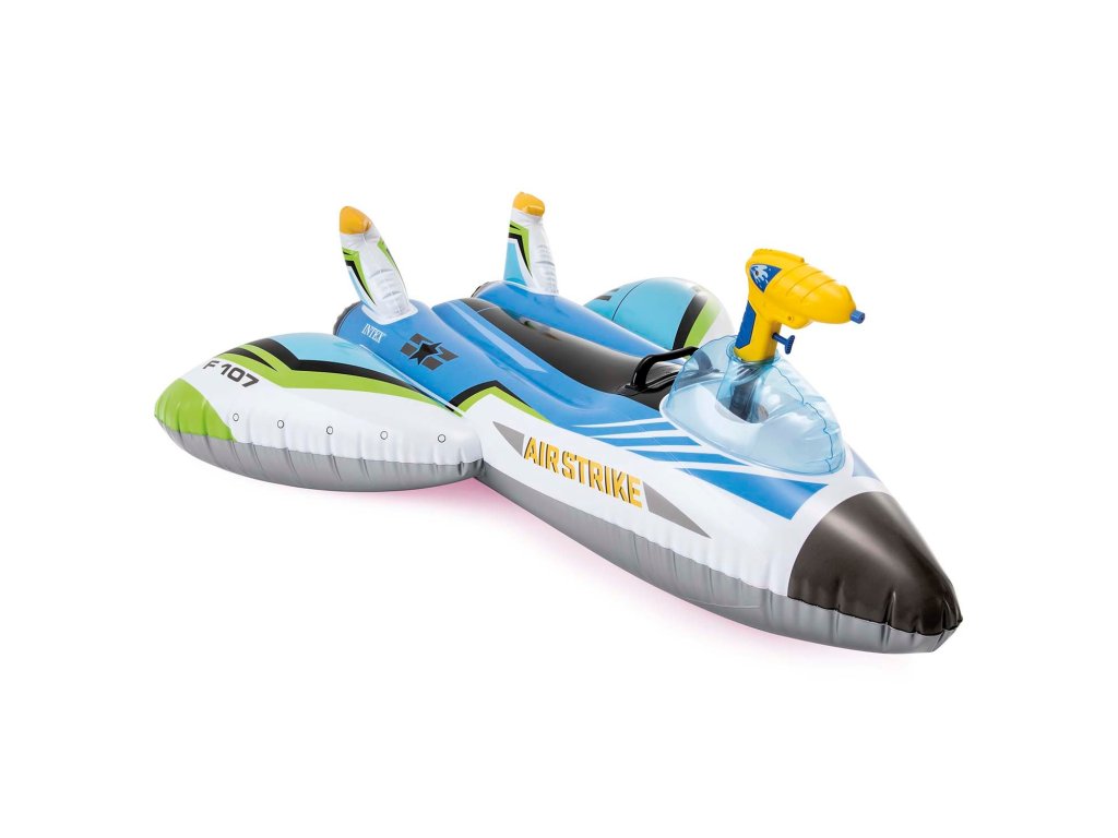 Napihljivo letalo z vodnim topom 117 x 117 cm Zračna pustolovščina v bazenu! Neverjetna napihljiva žimnica v obliki curka bo navdušila vsakega otroka. Udobna oblika za sedenje, močan ročaj in trpežen PVC material poskrbijo, da bo žimnica odlična za igro v vodi. Curek je opremljen z vodnim topom. Vaš otrok bo lahko doživel fantastične vodne bitke. Glavne značilnosti: udoben ročaj vodni top popravljalni obliž v kompletu Tehnični podatki: Dimenzije: 117 x 117 cm Material: PVC Teža: 0,955 kg Priporočena starost: od 3 letAdditional parameters