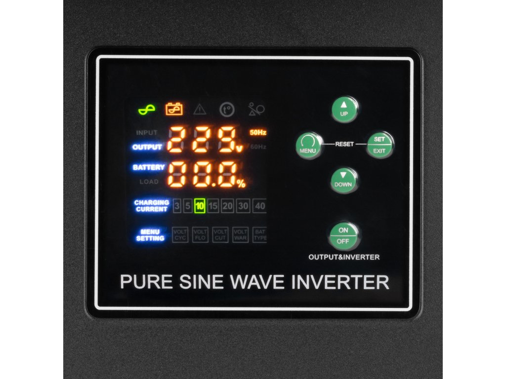 Način rezervnega napajanja z možnostjo polnjenja pretvarja enosmerno napetost 12V DC, ki jo zagotavlja zunanja baterija, v izmenično napetost 230V AC ter polni zunanjo baterijo. Način polnjenja polni zunanjo baterijo. Način pretvornika pretvarja enosmerno napetost 12V DC iz baterije v izmenično napetost 230V AC.
