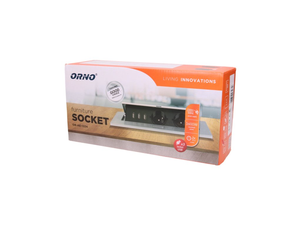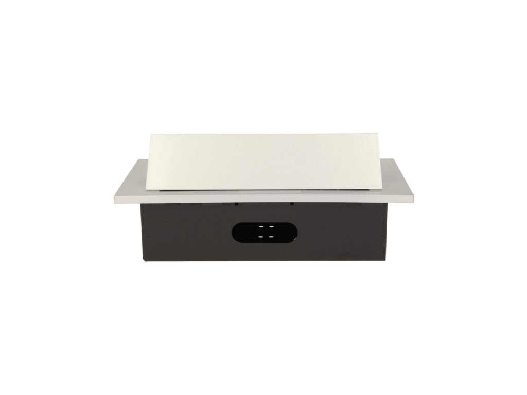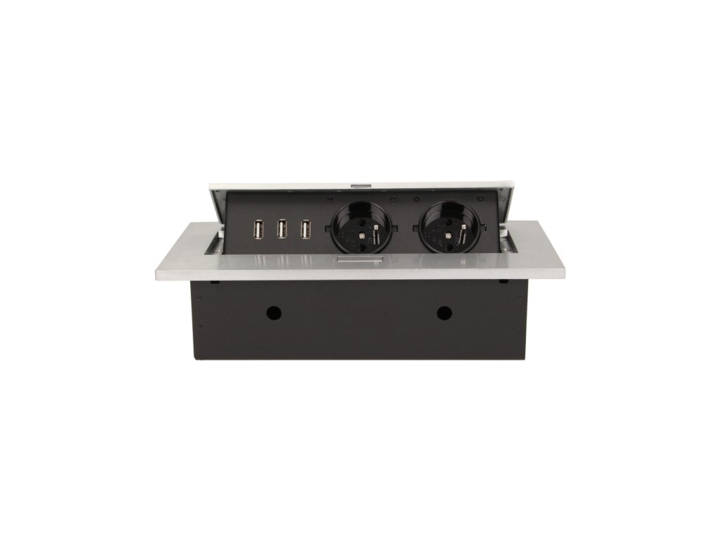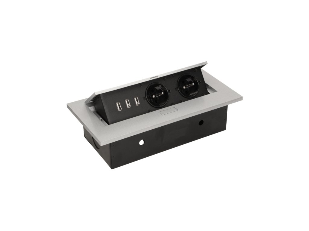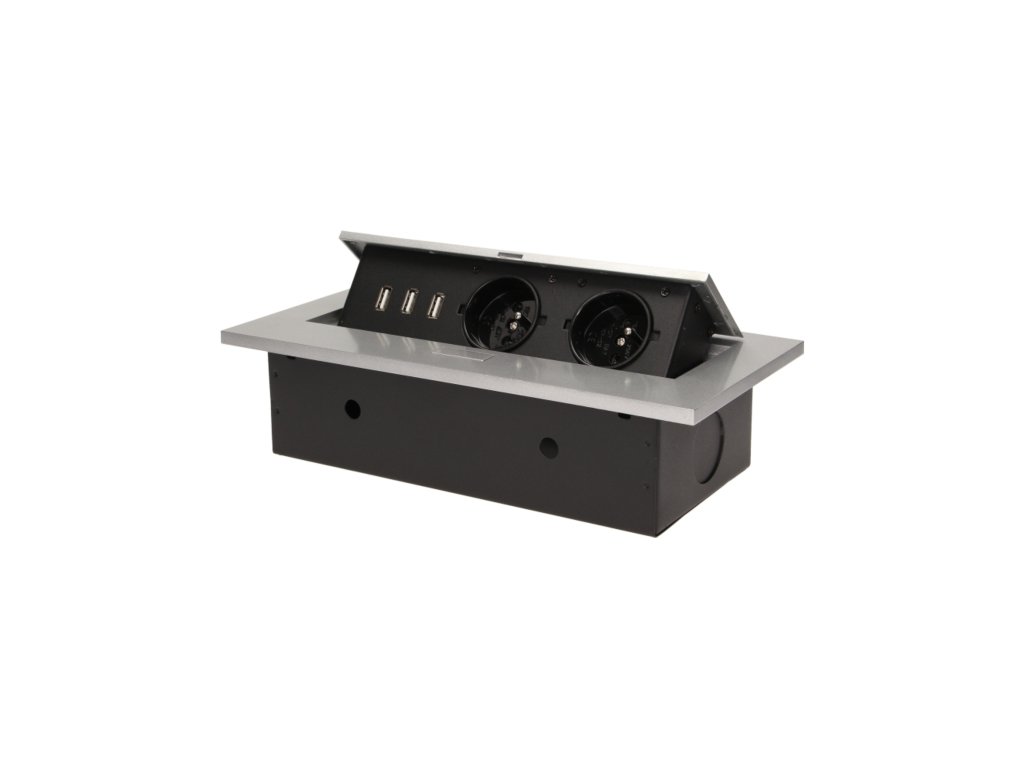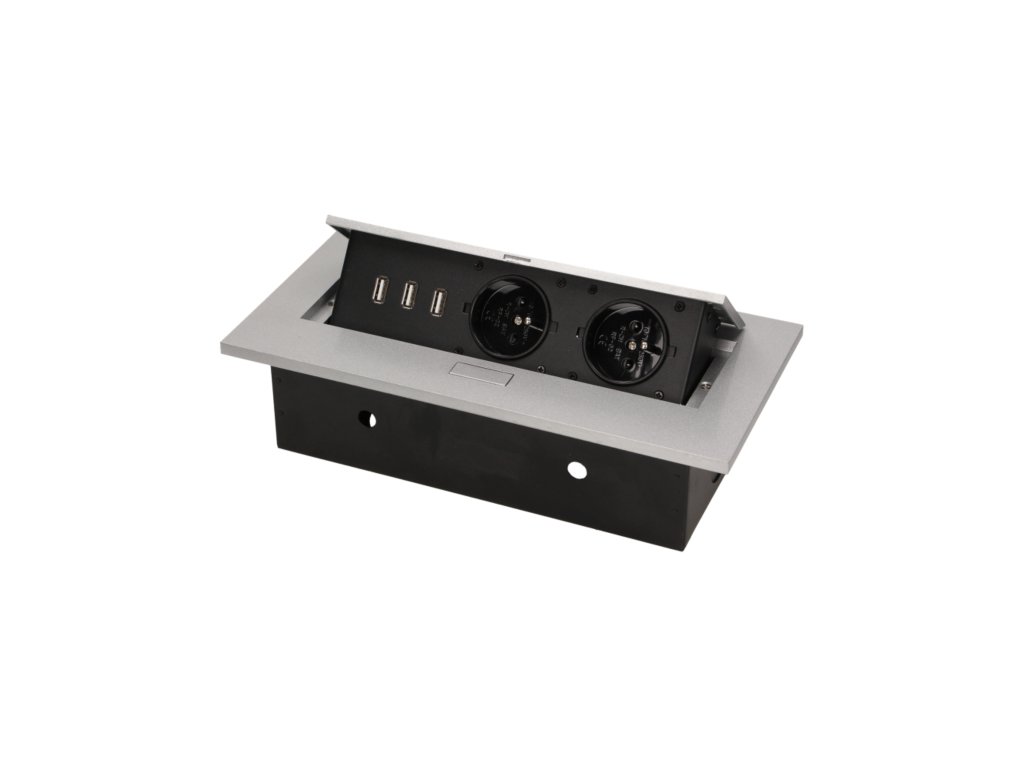 Komplet dveh vtičnic 2P+Z s tremi USB vhodi (brez napajanja) v izvlečnem zgornjem pokrovu. Namenjen za notranjo instalacijo v mize, mizne plošče in mizice v vertikalni in horizontalni legi, zagotavlja dostop do električnih vtičnic.Tehnične specifikacije
