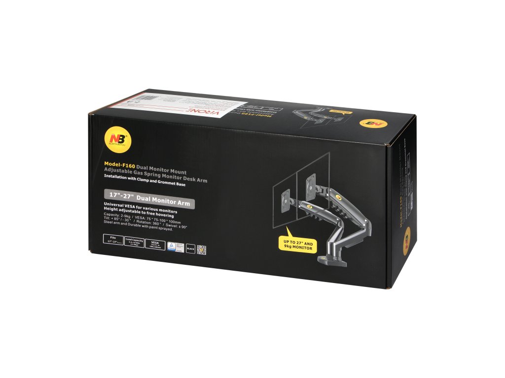 - Univerzalna združljivost: Nosilec je združljiv z monitorji od 17" do 27", omogočajoč stabilno in varno pritrditev različnih modelov. VESA standardni vmesnik zagotavlja enostavno namestitev in prilagoditev.