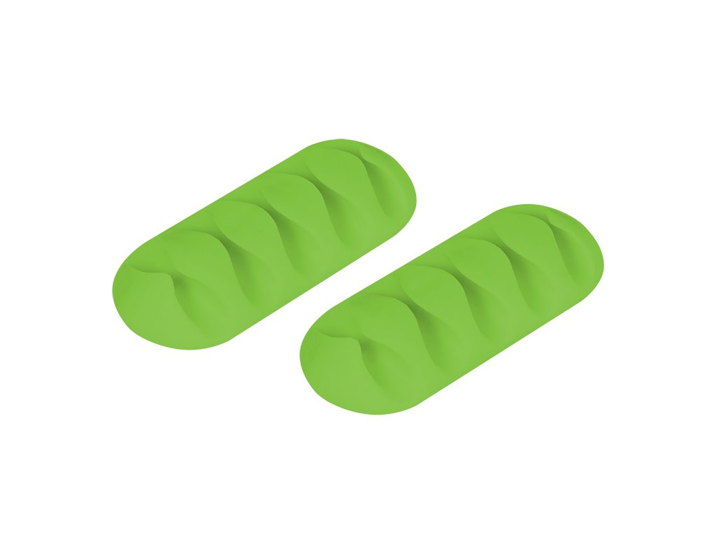 Samolepilni organizator kablov s 5 sponkami v zeleni barvi. Izdelek omogoča enostavno povezovanje in urejanje več žic, kablov in pramenov v en sveženj. Izdelan je iz elastične plastike, odporne na poškodbe.
