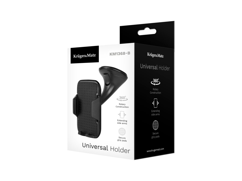 Nosilec za pametni telefon Kruger&Matz je univerzalen in ustreza vsakemu telefonu širine od 5,5 cm do 8,7 cm. Vrtljiva konstrukcija 360° omogoča prilagoditev ustreznega kota pogleda, mehka notranja obloga pa zagotavlja protizdrsno pritrditev in ščiti ohišje naprave pred praskami.