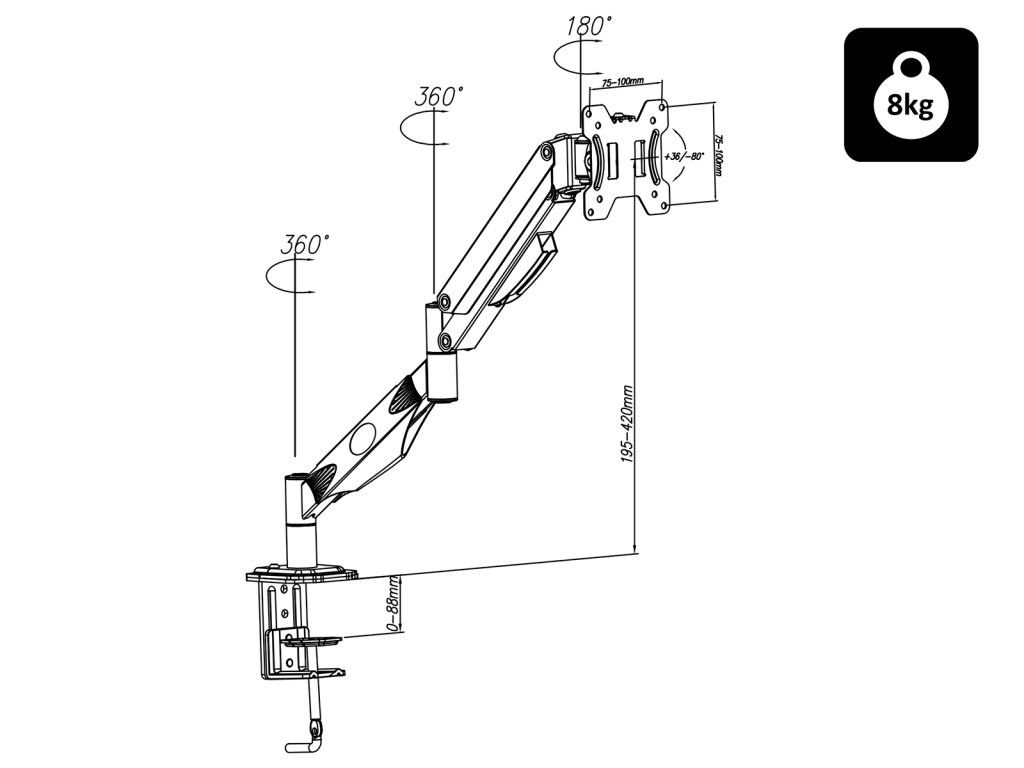 Univerzalni namizni nosilec s spojem je zasnovan za obešanje tankega televizorja ali monitorja na navpično steno. Največja nosilnost nosilca do približno 8 kg. Velikost nameščenega zaslona je v mejah 13" - 27". Nosilec omogoča enostavno nastavitev nagiba panela v mejah -45/+45 stopinj.