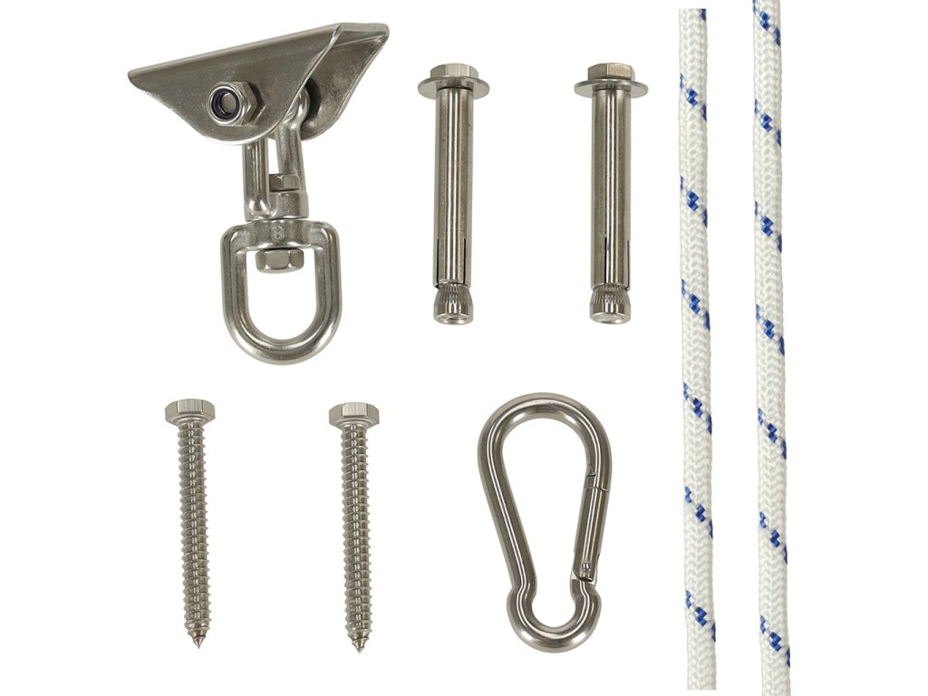 Komplet vsebuje dele, kot sta vrtljiv stropni kavelj, karabin, vrv in štiri vijake - z drugimi besedami, vse, kar boste potrebovali!