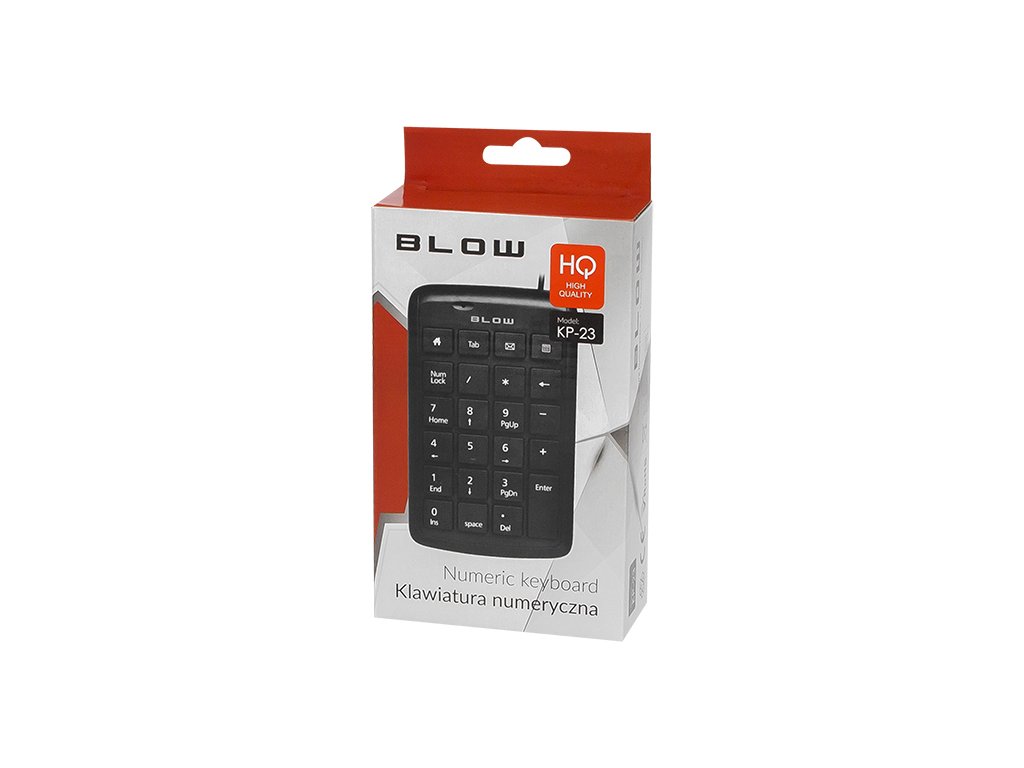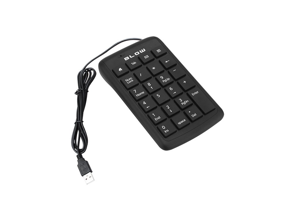 Žična numerična tipkovnica blagovne znamke Blow z USB vmesnikom, izdelana iz visokokakovostnih materialov s povečano odpornostjo na vlago. Poleg standardnih tipk za numerično tipkovnico ima tipko Backspace, kar omogoča nemoteno delo. Zaradi svojih majhnih dimenzij jo je mogoče brez težav spakirati v torbo skupaj z prenosnikom.