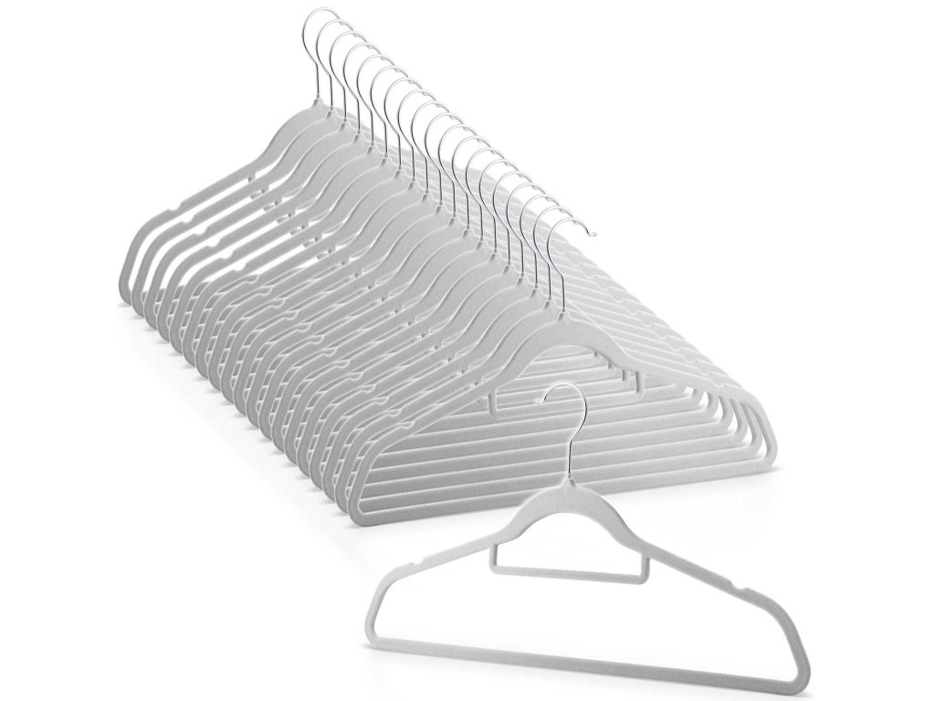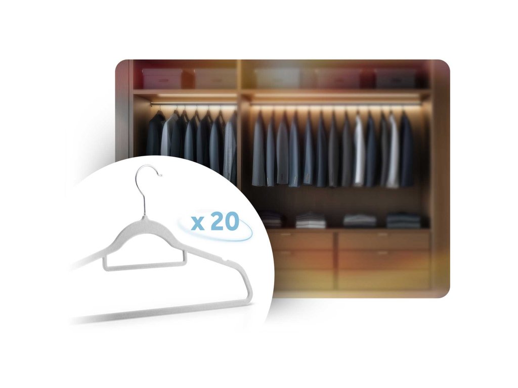 Organizirajte svojo garderobo v stilu s kompletom 20 žametnih obešalnikov od Massido.